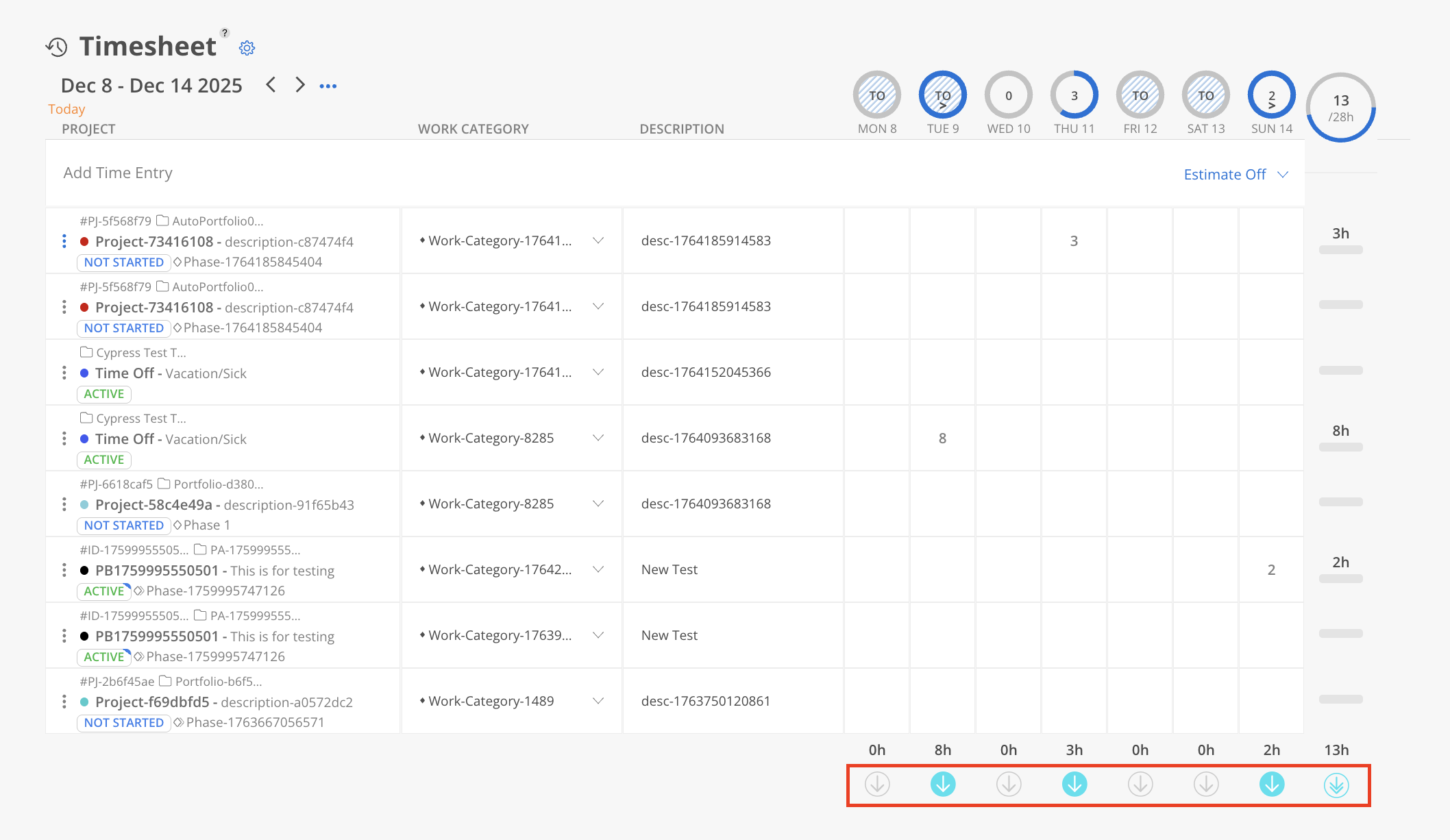 The Timesheets for each project and each day will be displayed, as well as the total hours for the day and the week.