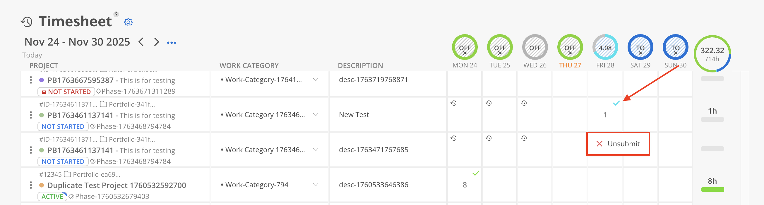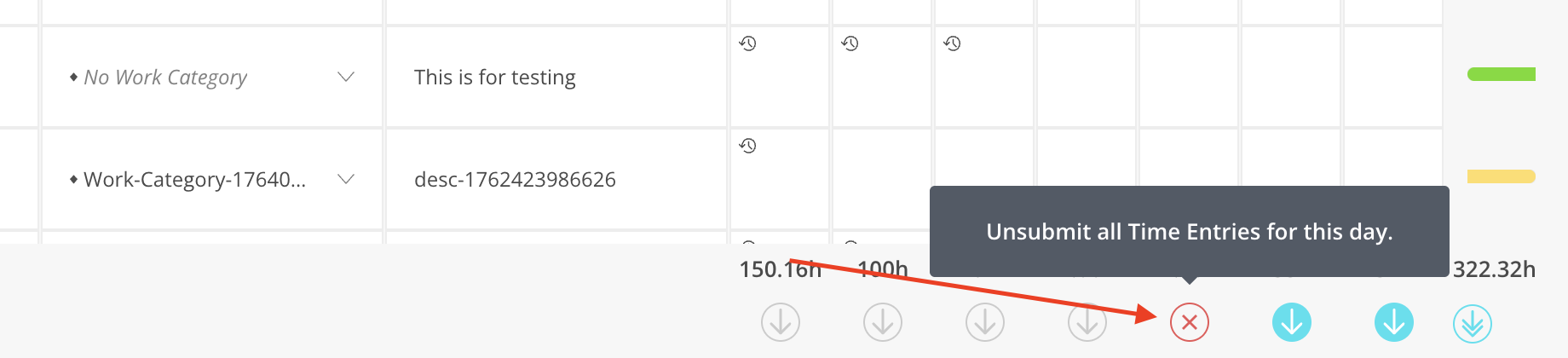 Hover on the gray arrow button you will see "Unsubmit all Time Entries for this day" button. This allows you to unsubmit all submitted Time Entries for the selected day.