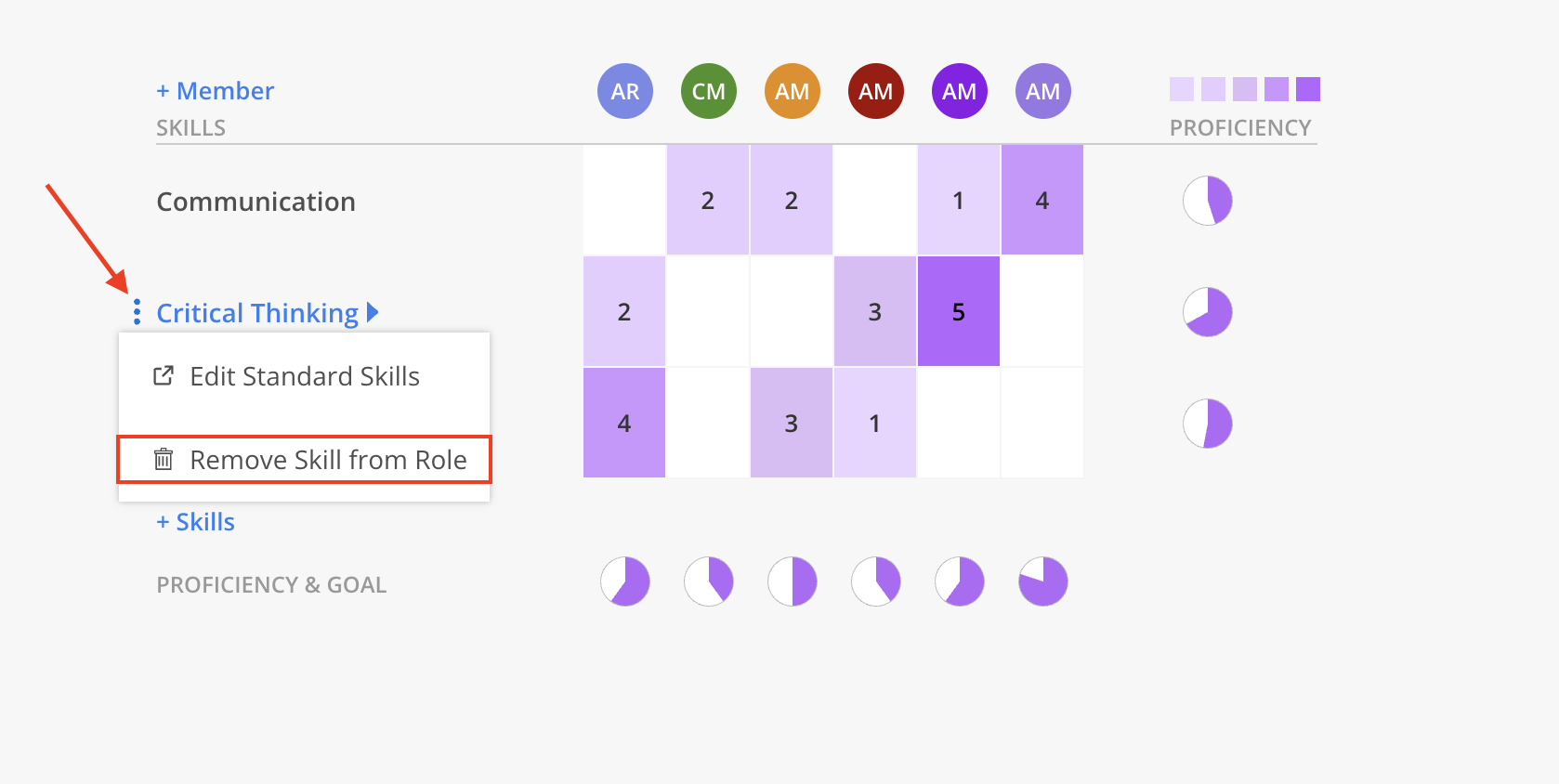 To remove a Skill from a Role, click the three-dot menu next to the desired Skill and select Remove Skill from Role.