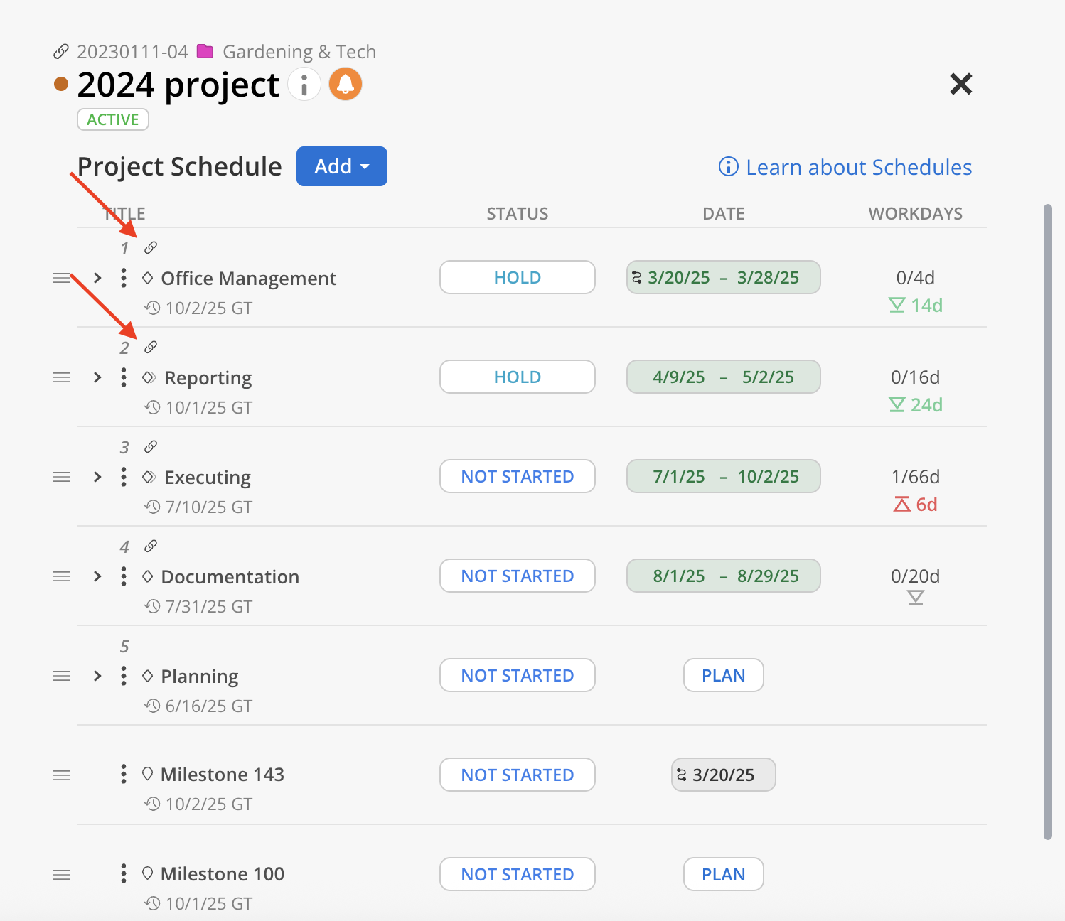 Rearrange Items: Click and hold the three horizontal lines to re-arrange Phases, Subphases, and Milestones. This is not possible for Work Categories at the moment.