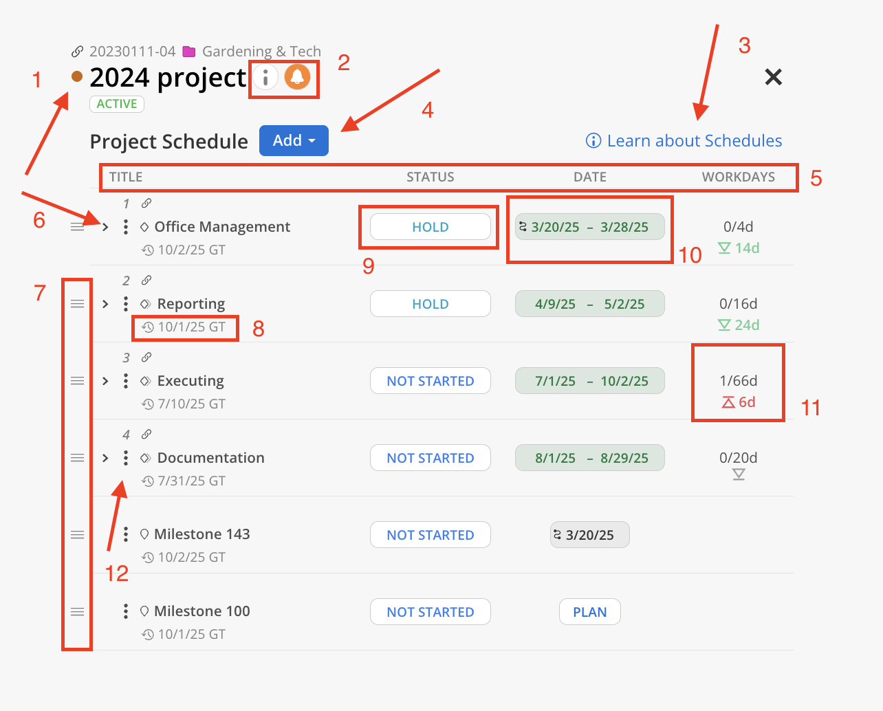Date range of the Phase, Subphase, Work Category or date of a Milestone: Shows the scheduled date of a Phase, Subphase, Milestone, or Work Category.