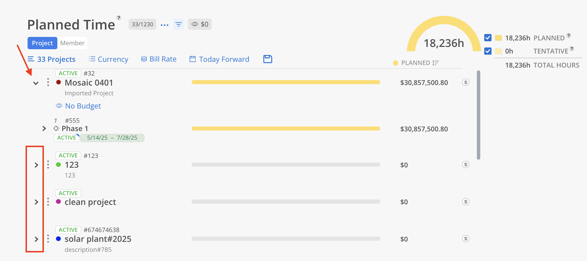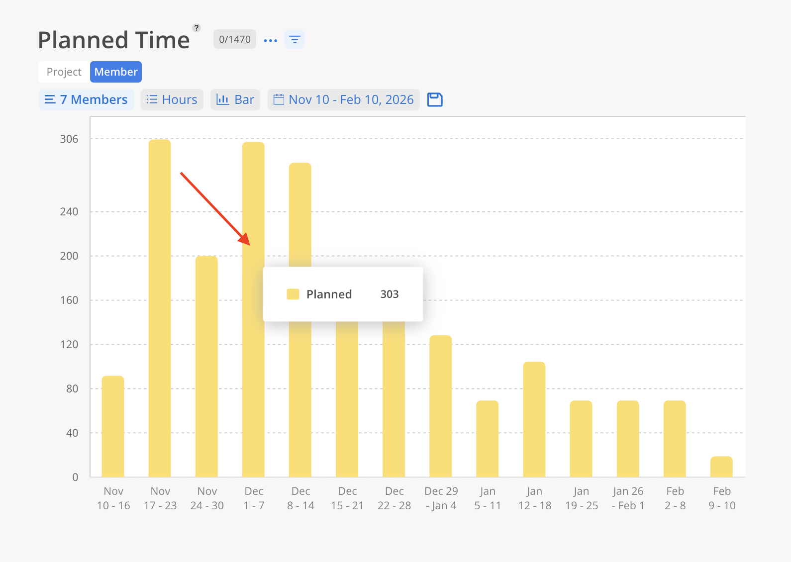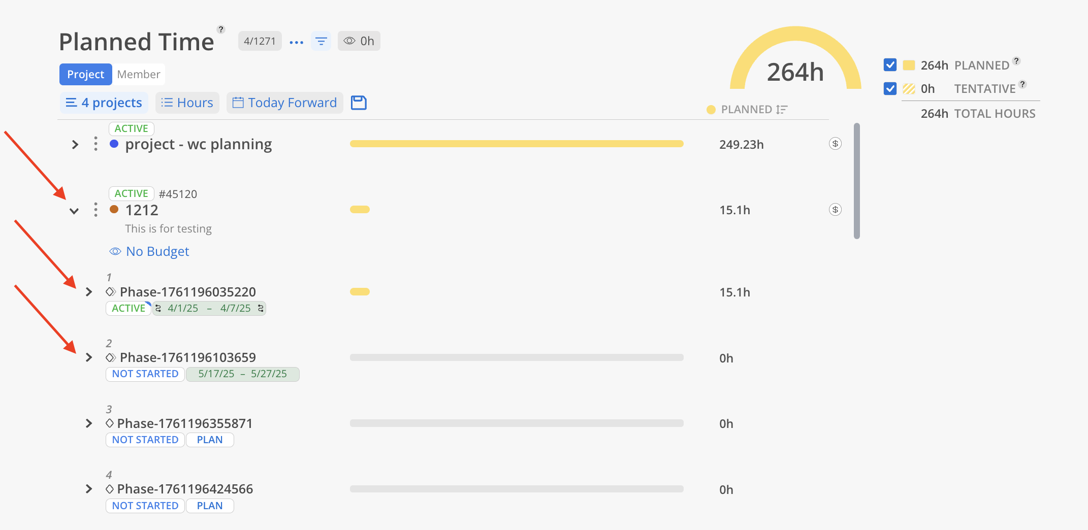 Click on the caret next to the project name in order to expand and view more granular phase level and member level planned time.