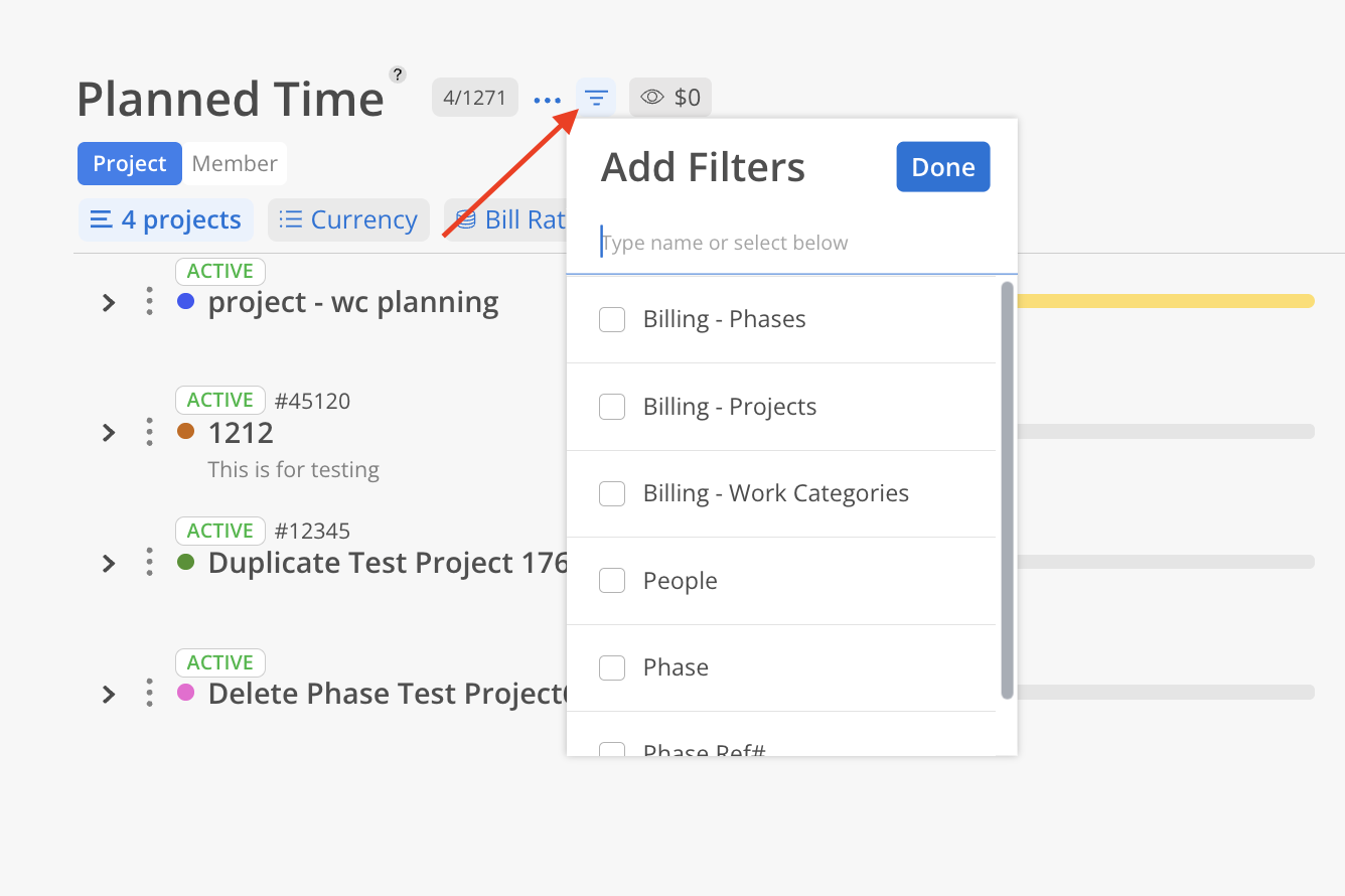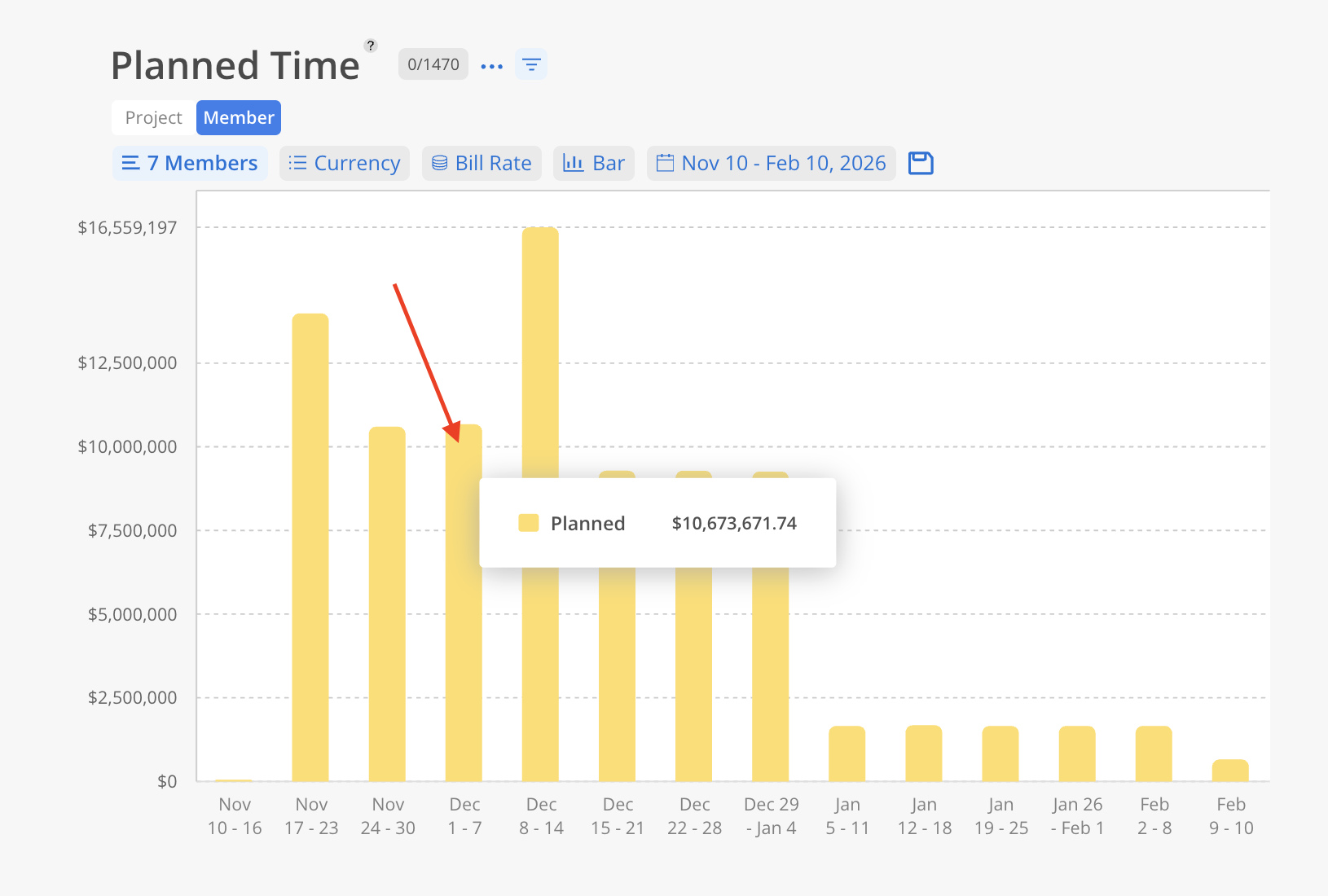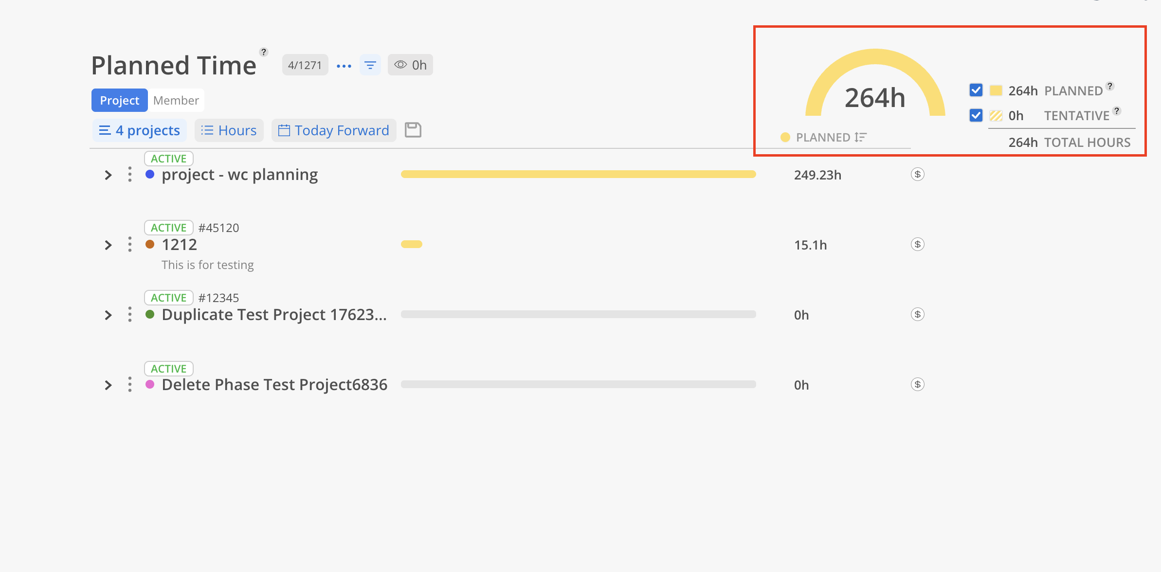 Click on the caret next to the project name in order to expand and view more granular phase level and member level planned time.
