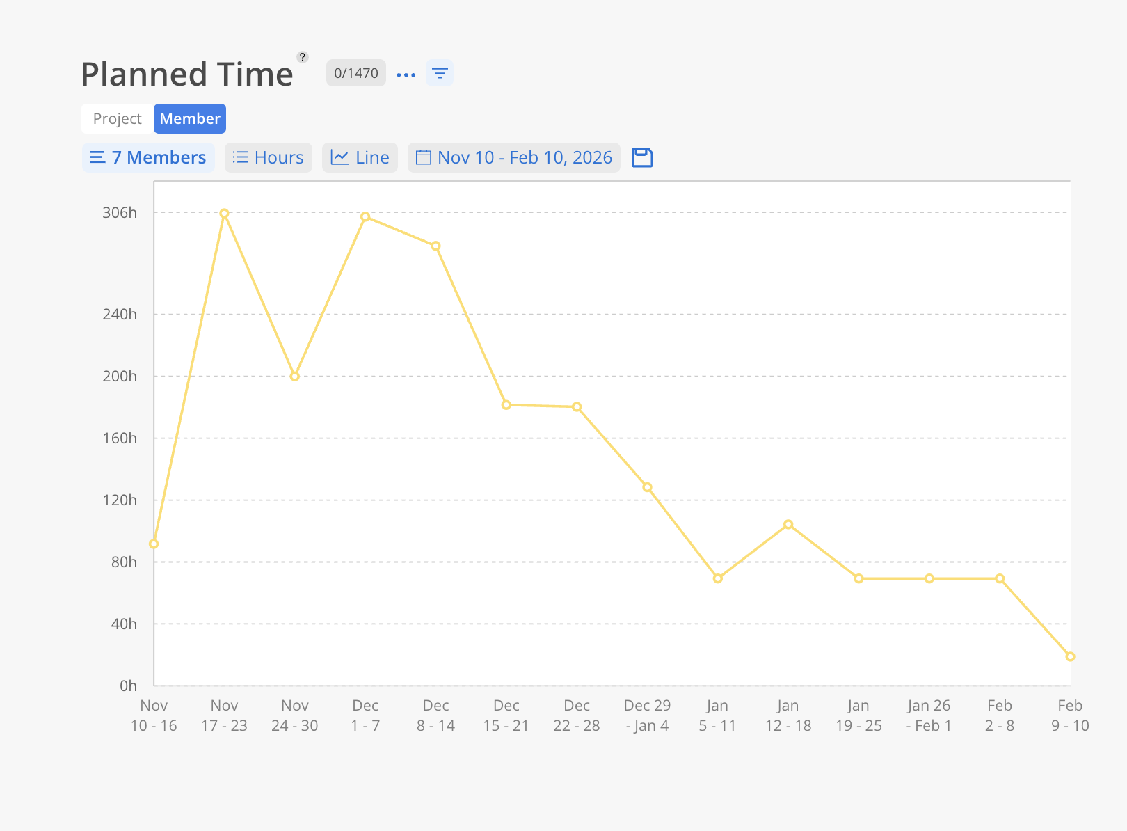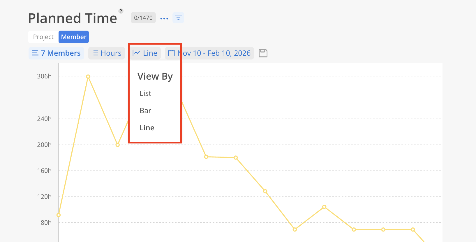 Member data can be viewed in multiple ways, including list, bar chart and line graph view. These options provide clear visual representations of team allocations, making resource planning more efficient and intuitive.