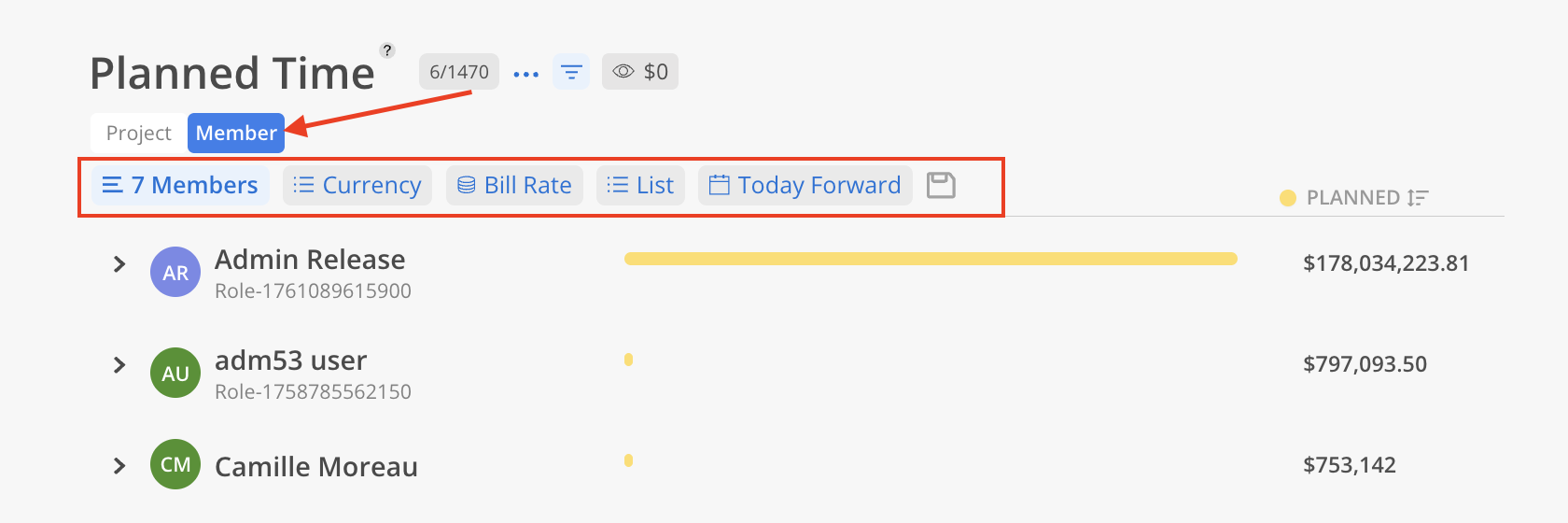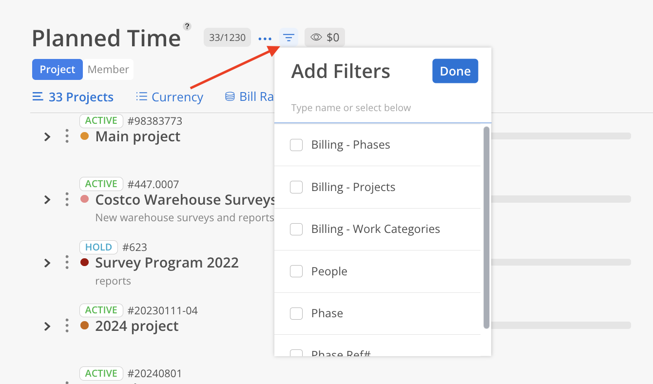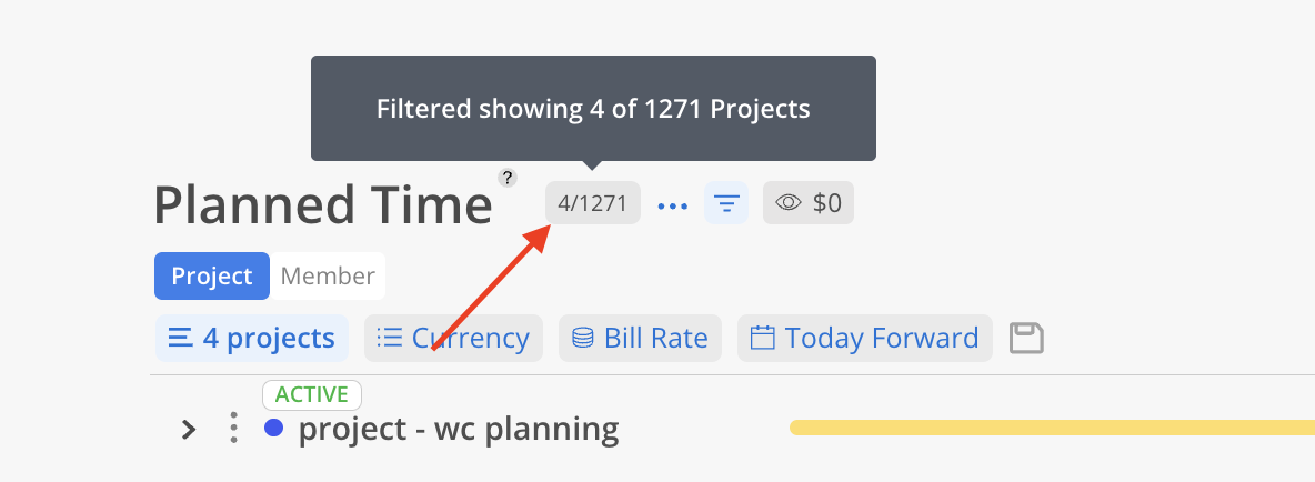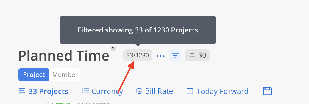 No Planned (eye icon): Hide Projects that have no planned hours. In the Currency view, a Member has no Rate will be excluded from the report totals—even if they have Planned Hours.