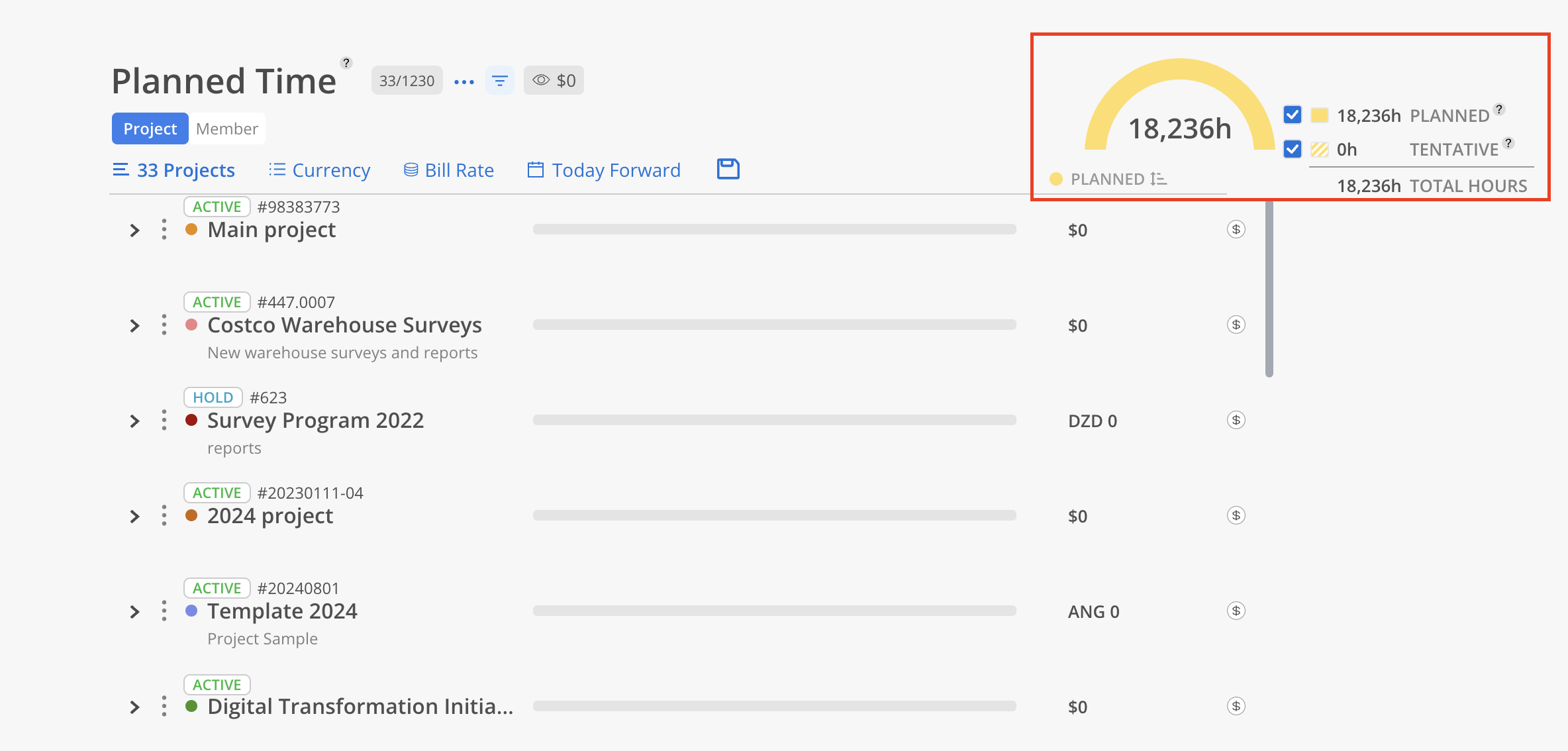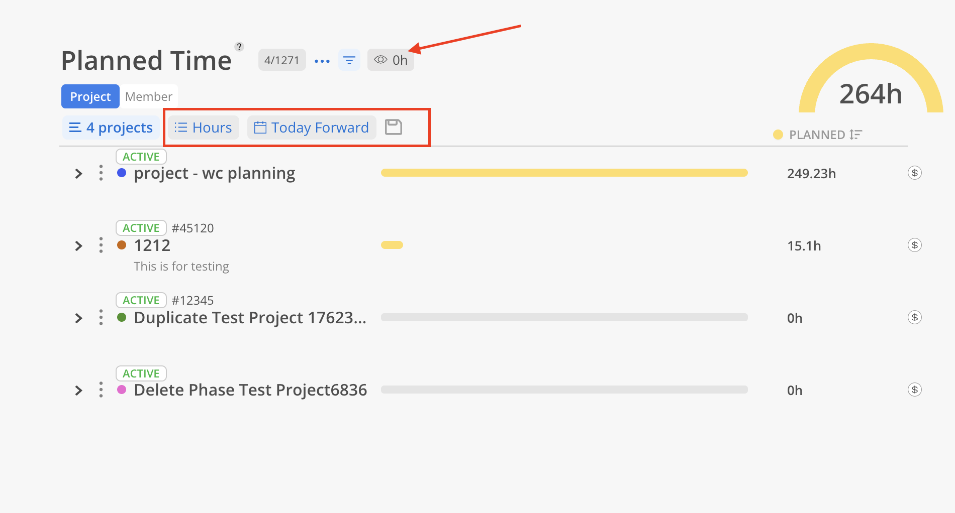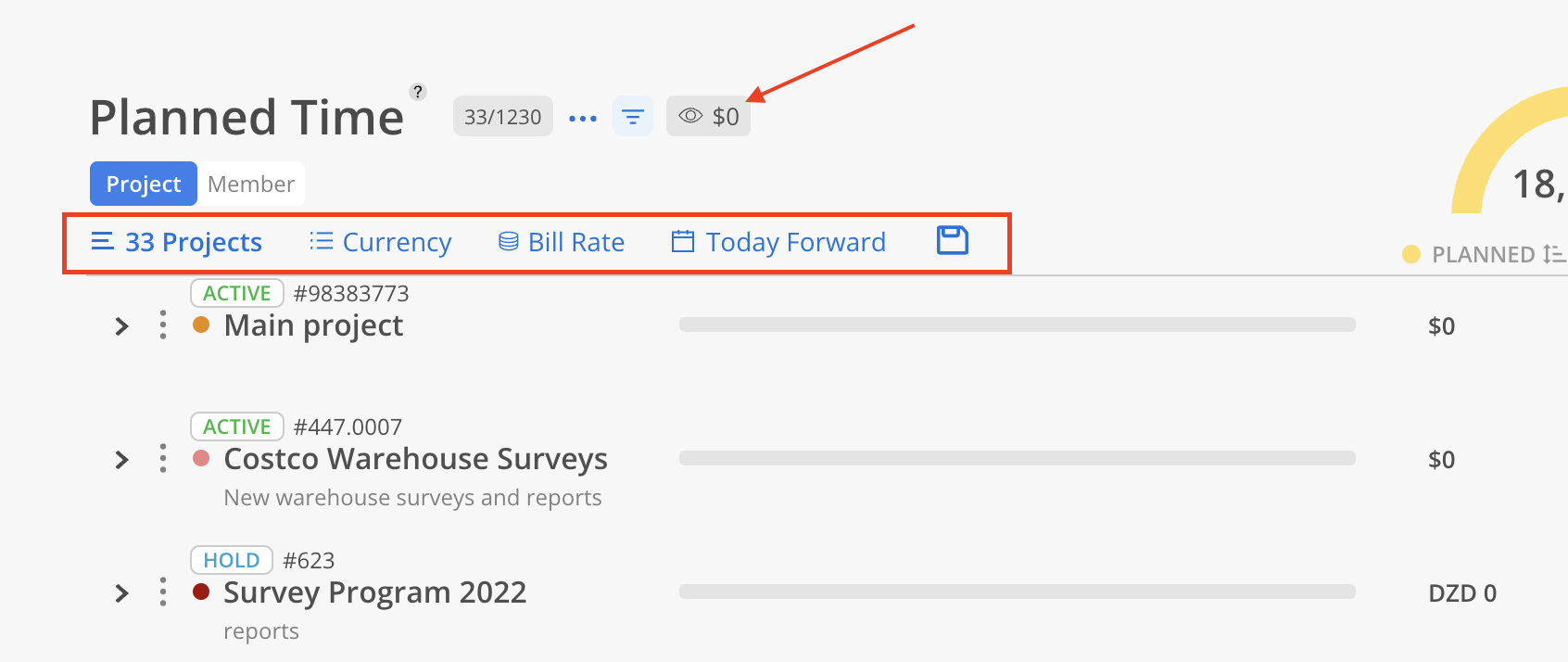 No Planned (eye icon): Hide Projects that have no planned hours. In the Currency view, a Member has no Rate will be excluded from the report totals—even if they have Planned Hours.