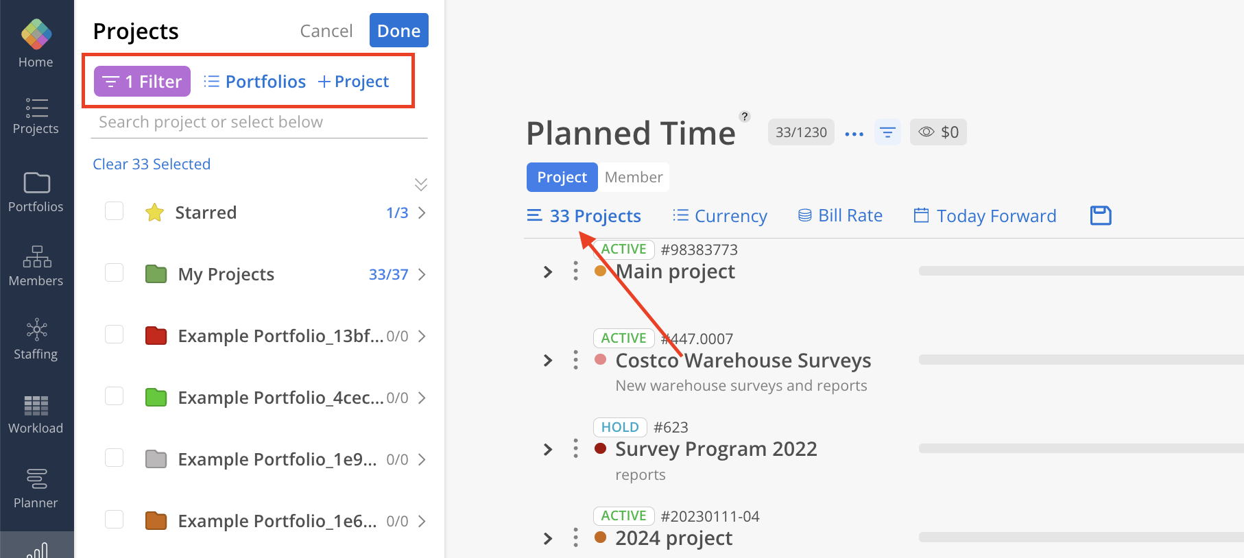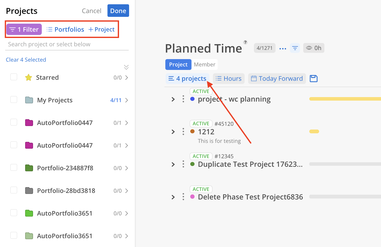 To refine the list of Projects, click the Filter button to drill into specific categories or criteria. Use the Portfolios button to group Projects by Individual Projects, Portfolios, or Members.