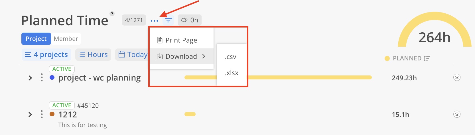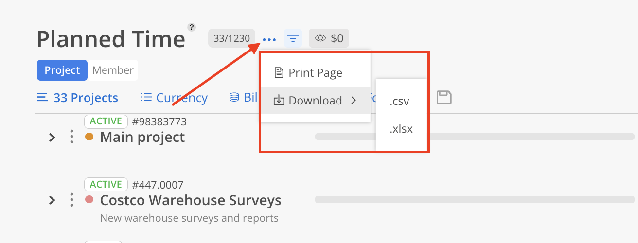 Lastly, this report can be exported to CSV or XLS by selecting the three dots at the top of the report. This option is available exclusively in the Project view.