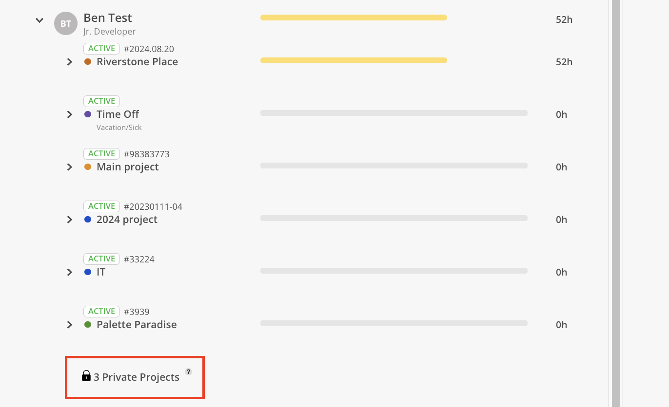 Projects without access permissions will be consolidated into a single row labeled "Private Projects" with the total count displayed. Bar and number will not be shown for this row.