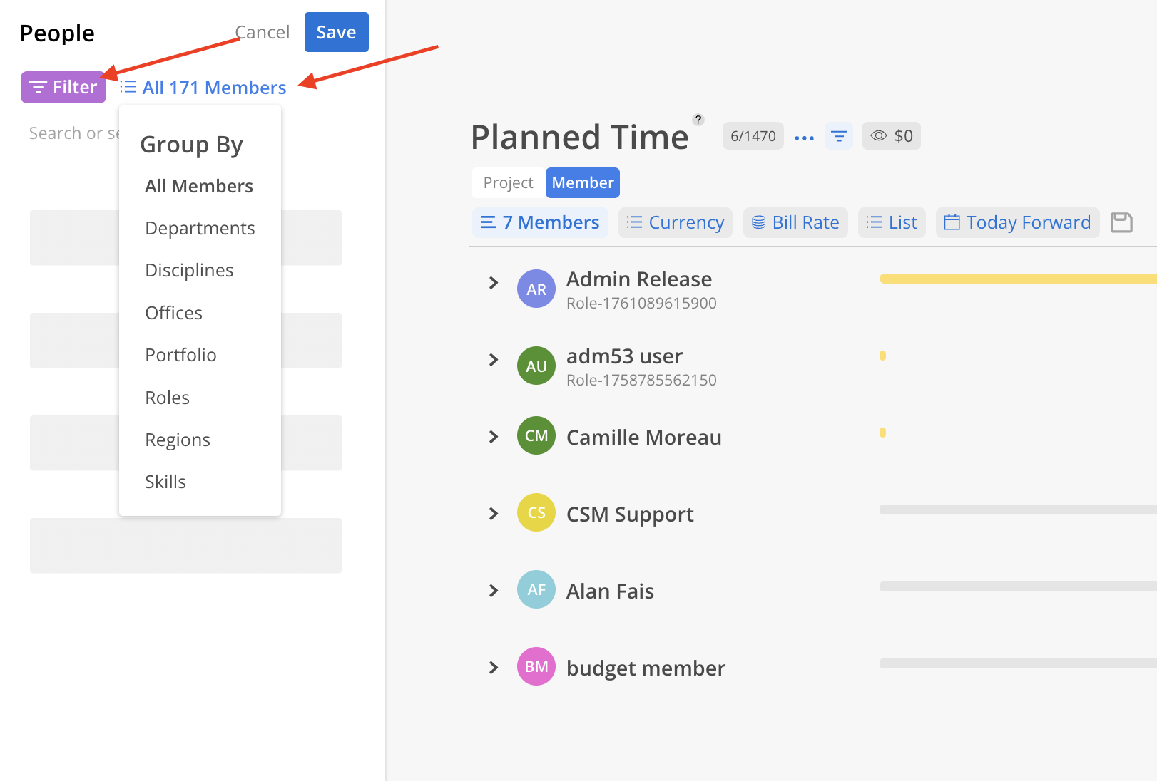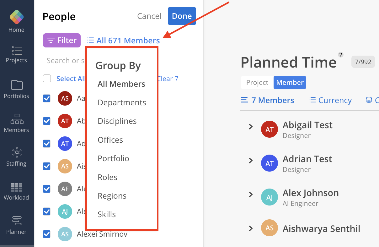 Click All Members to group Members by categories such as Department, Discipline, Office, Portfolio, Role, Region, or Skill.