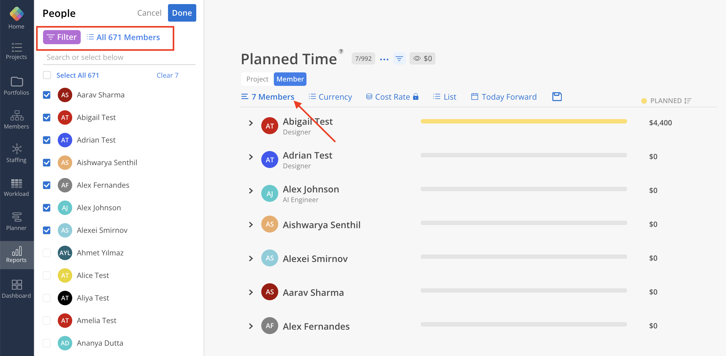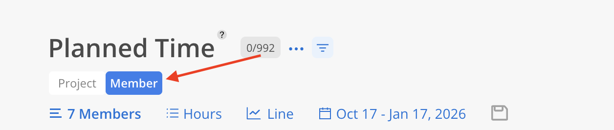 See how much time has been planned by Projects, or Members, over any period of time.