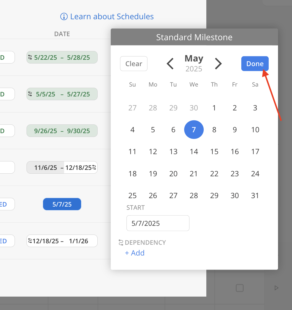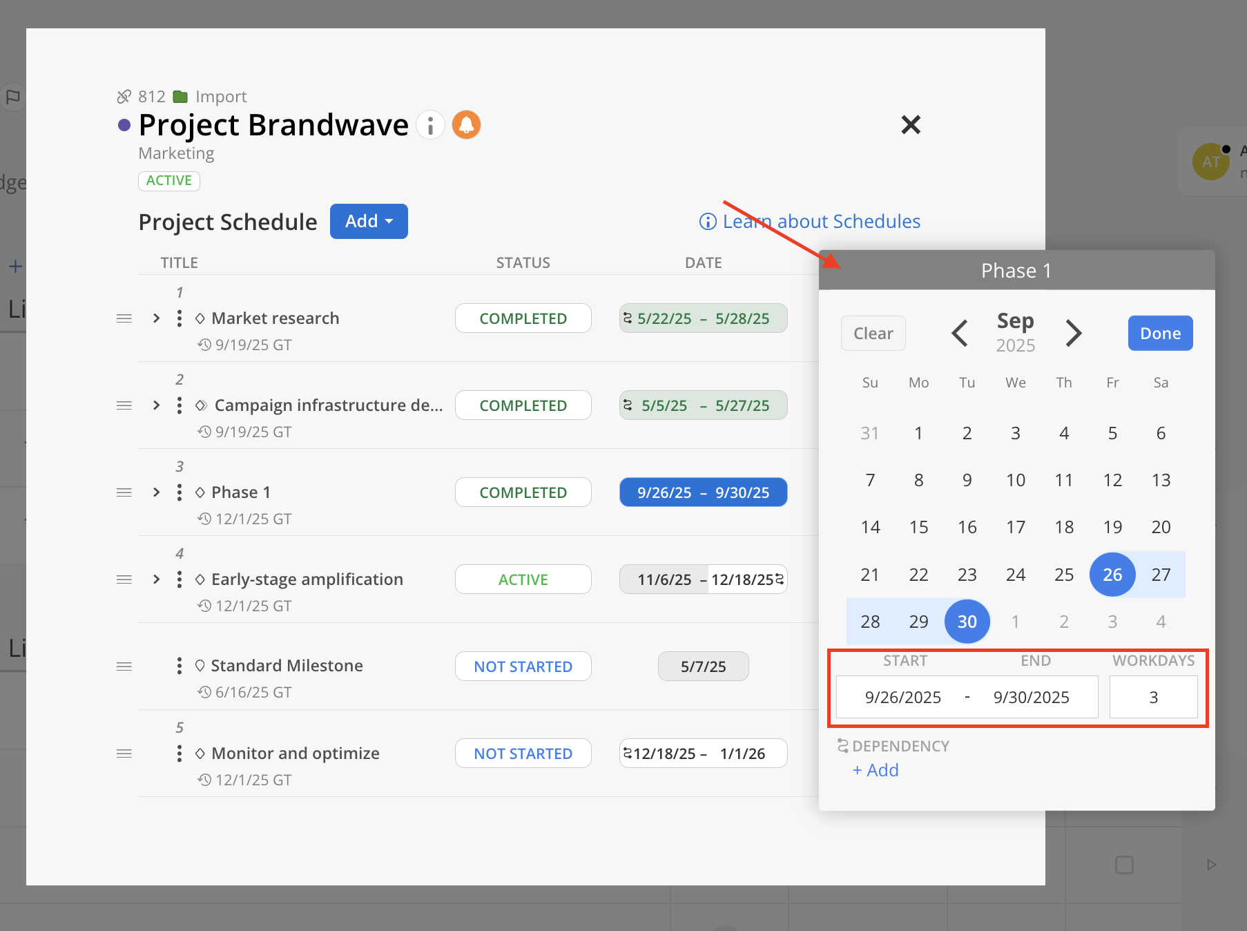 A calendar will display with the Phase, Subphase, Work Category, or Milestone name on the top. Select a date range or enter the number of workdays for the Phase, Subphase, or Work Category. Optionally, add a date dependency if needed.