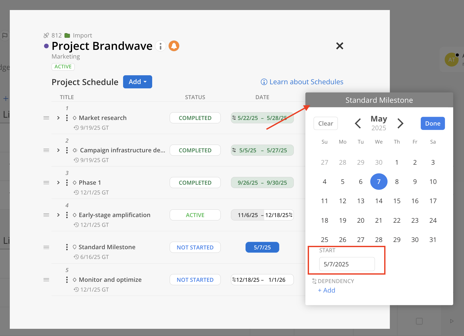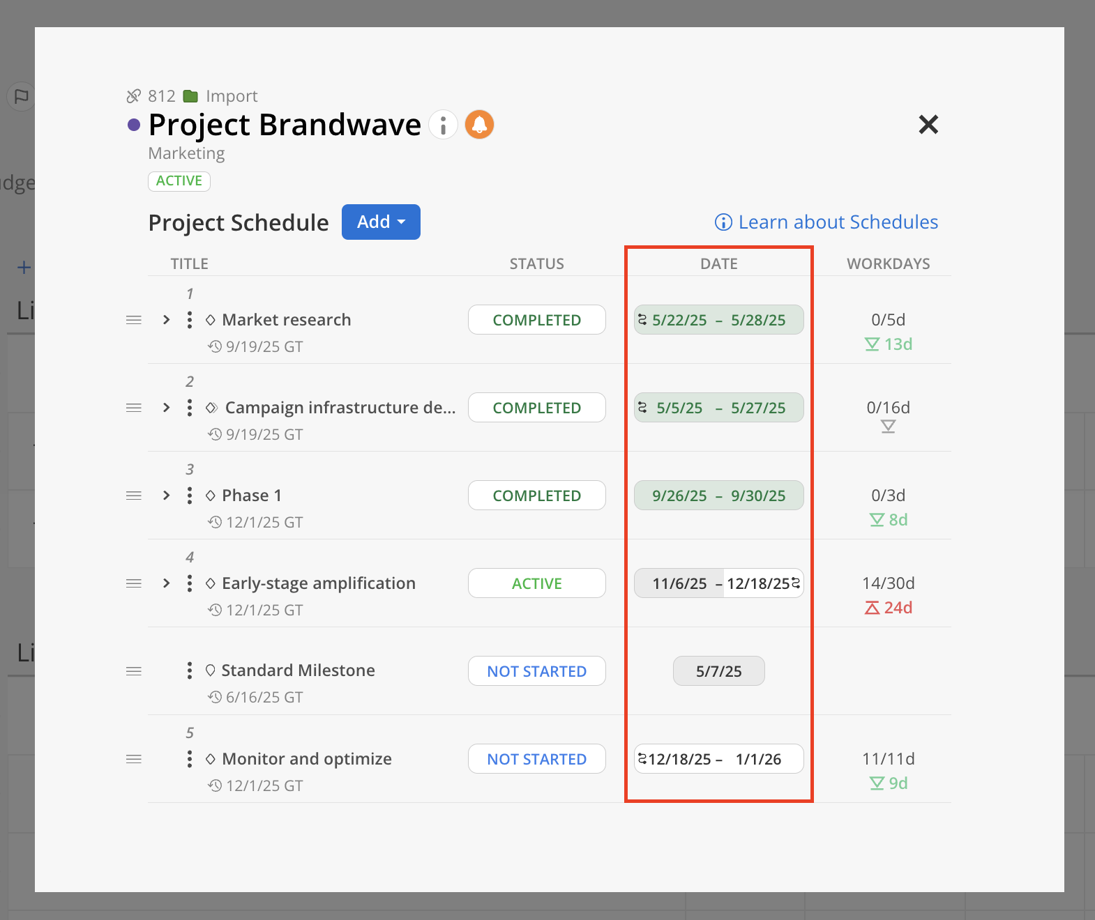 Click Date on a Phase, Subphase, Work Category, or Milestone.