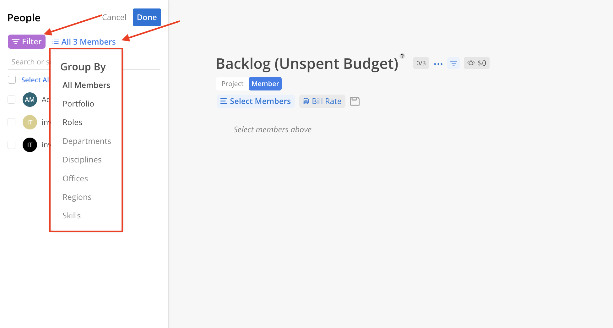 Click All Members to group Members by Departments, Disciplines, Offices, Portfolios, Roles, Regions, Skills