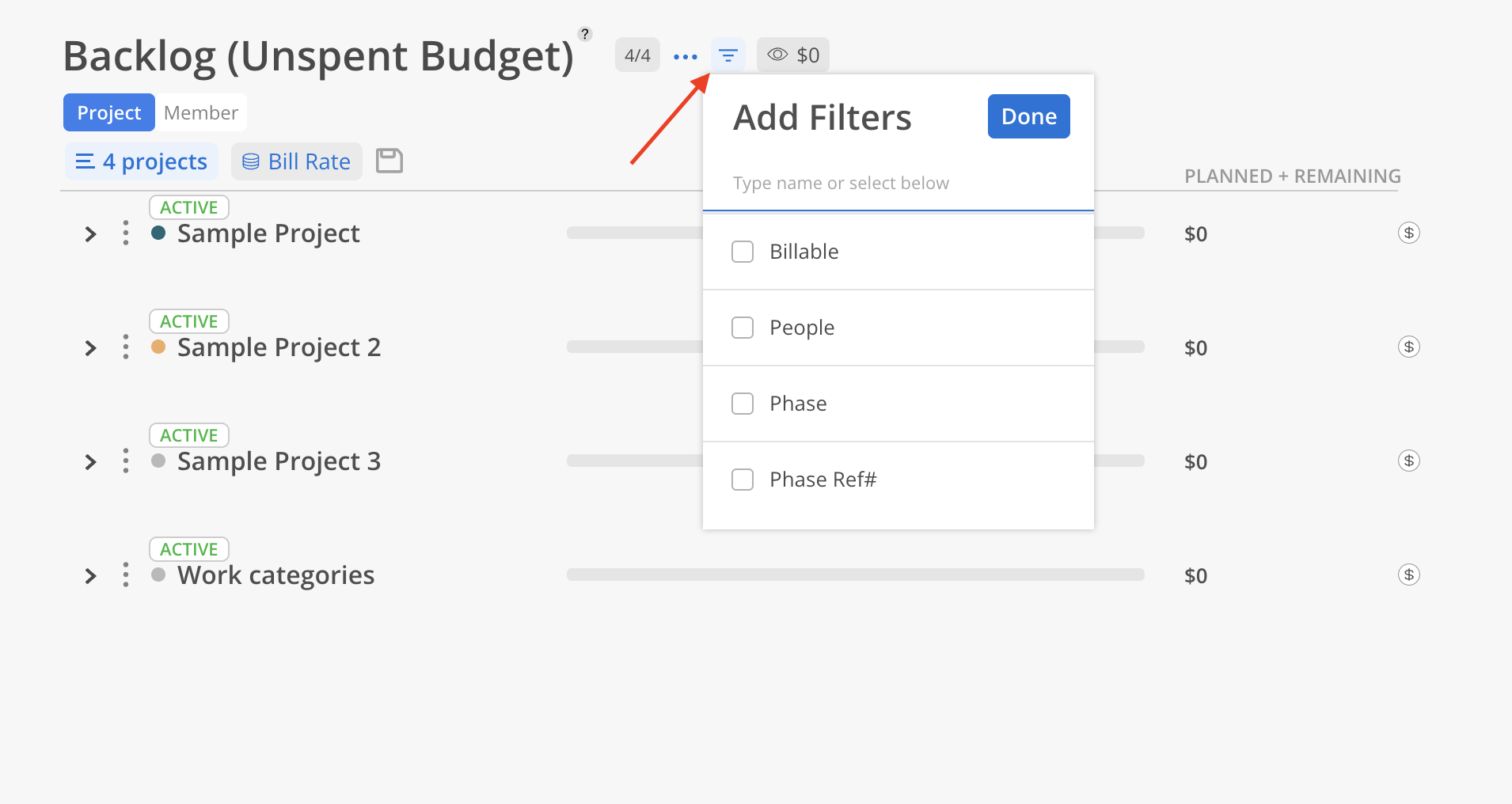 Selecting No Budget hides any Phases or Work Categories that do not have an assigned Fee Budget, allowing for a more focused view of budgeted work only.
