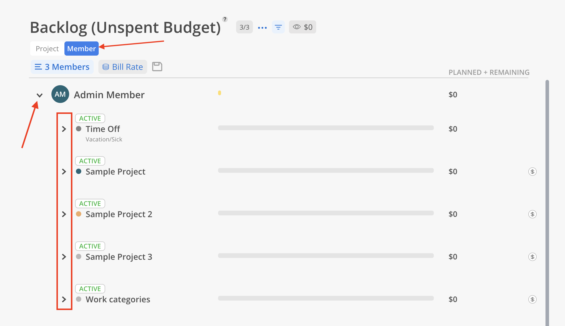 The Backlog Report provides visibility into how much time has been planned and how much time remains for each Project or Member. The Remaining time is calculated as: