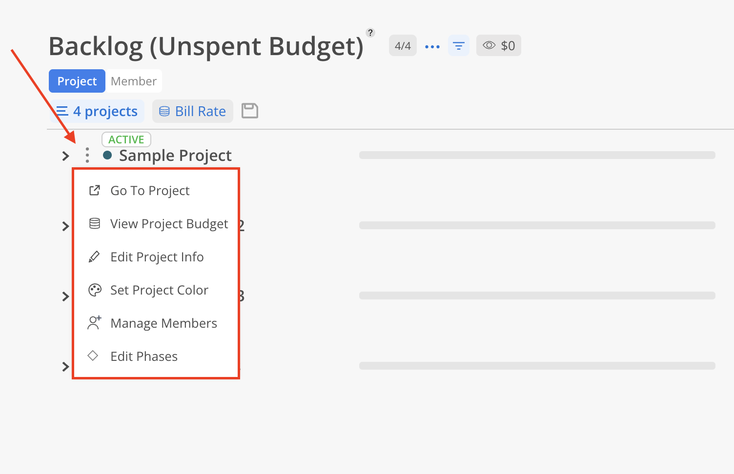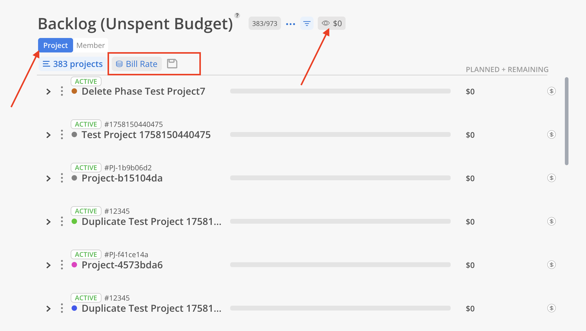 To manage visibility, select the eye icon to show or hide Projects that have no associated data (i.e., blank Projects).