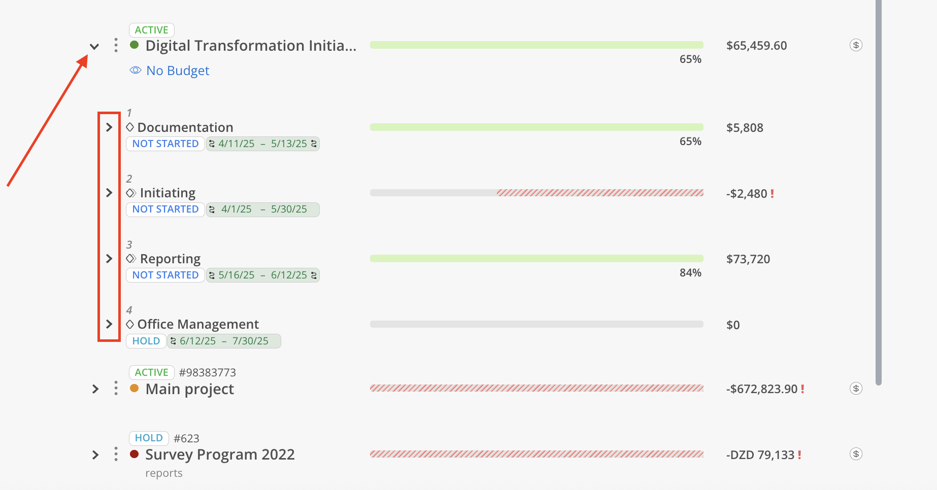 Click the arrow to the left of the Project name reveals a hierarchical breakdown of Planned and Remaining time, organized by Phases, Subphases, Work Categories, and Members. This expanded view enables a detailed analysis of how time is distributed across different levels of the Project.