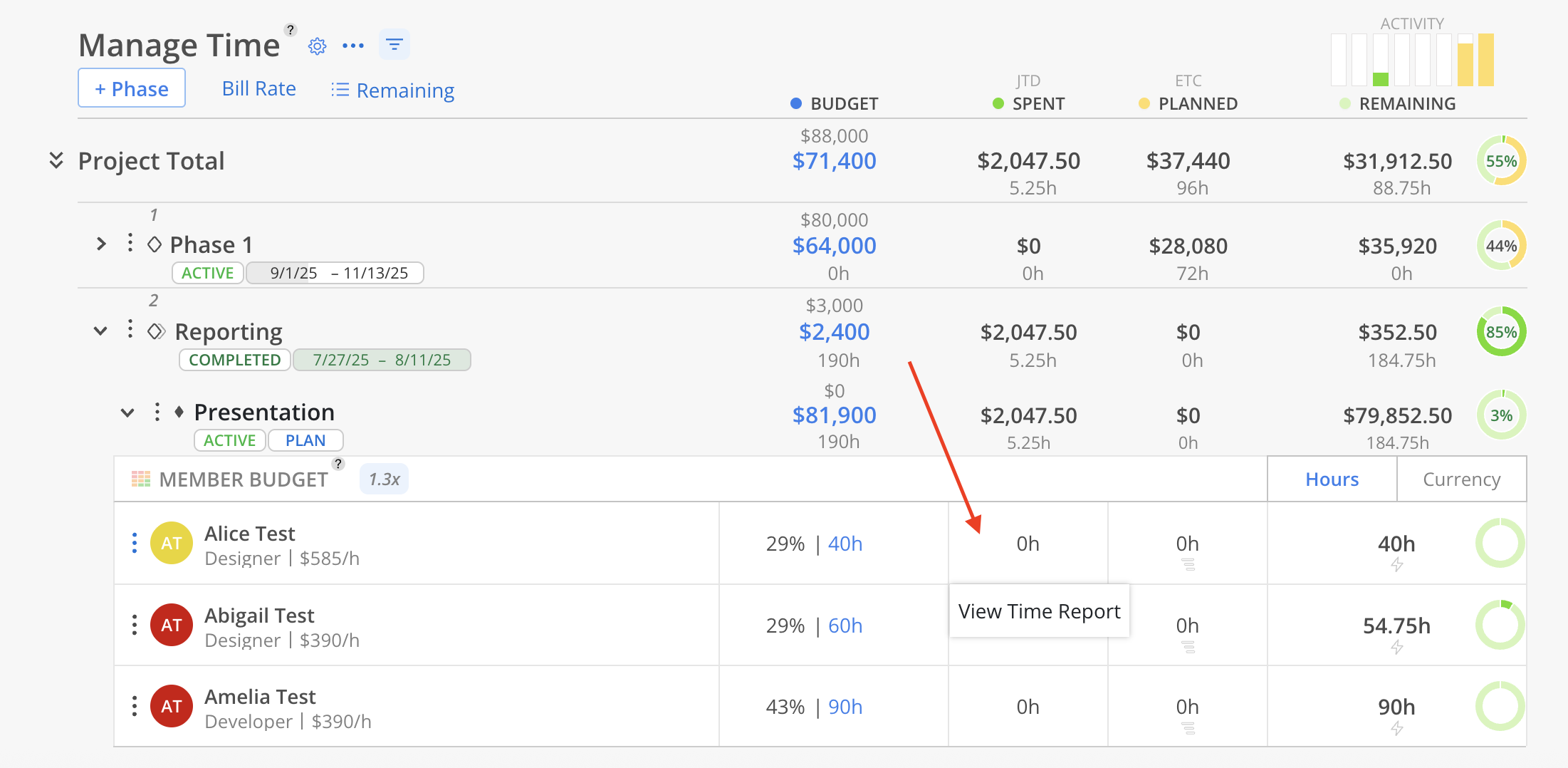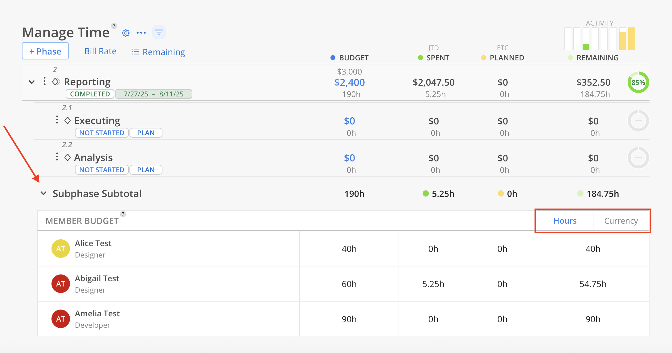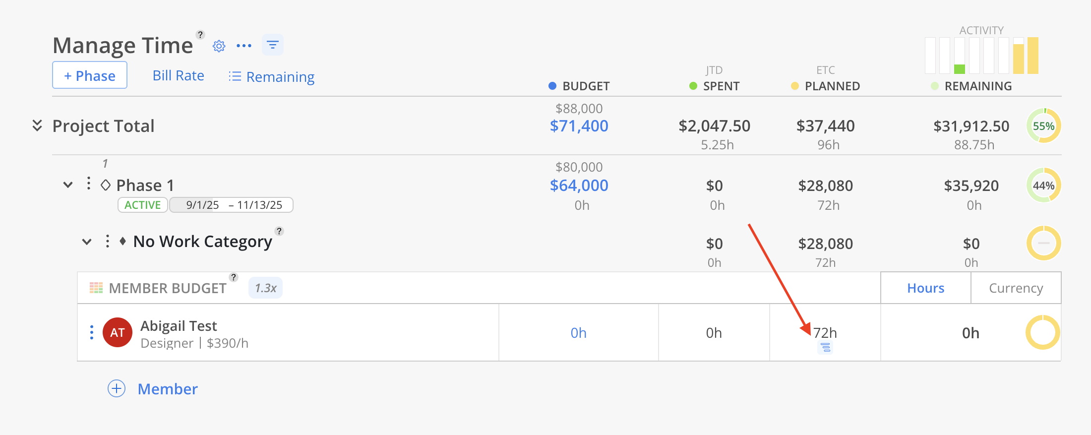 When the Phase or Subphase has budget with set to Member Time Budgets > Total Spent + Planned Time, the total estimated hours will be total the sum of Spent and Planned hours.
