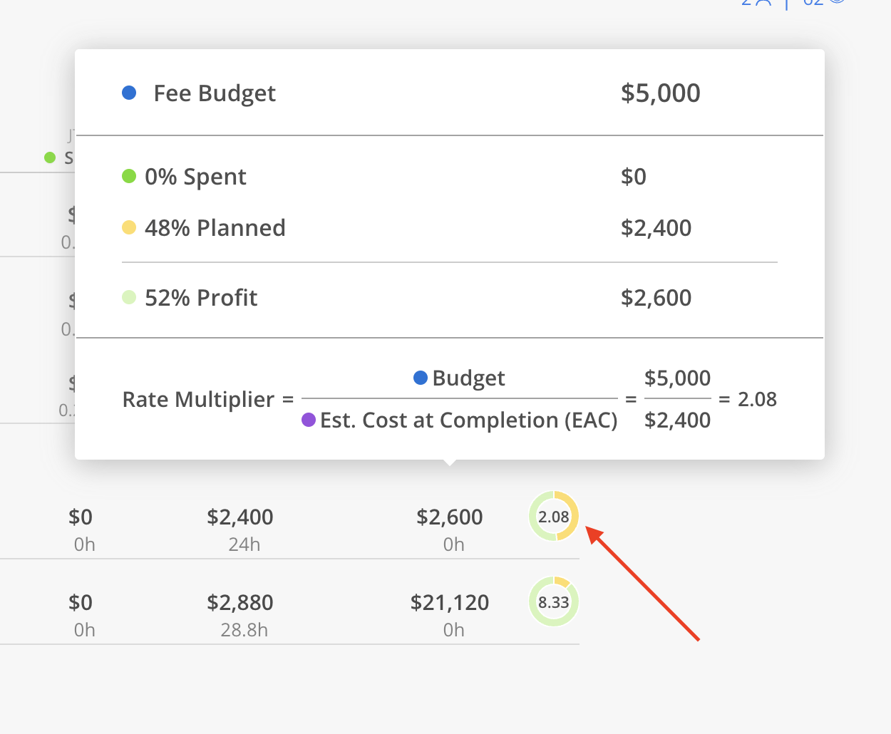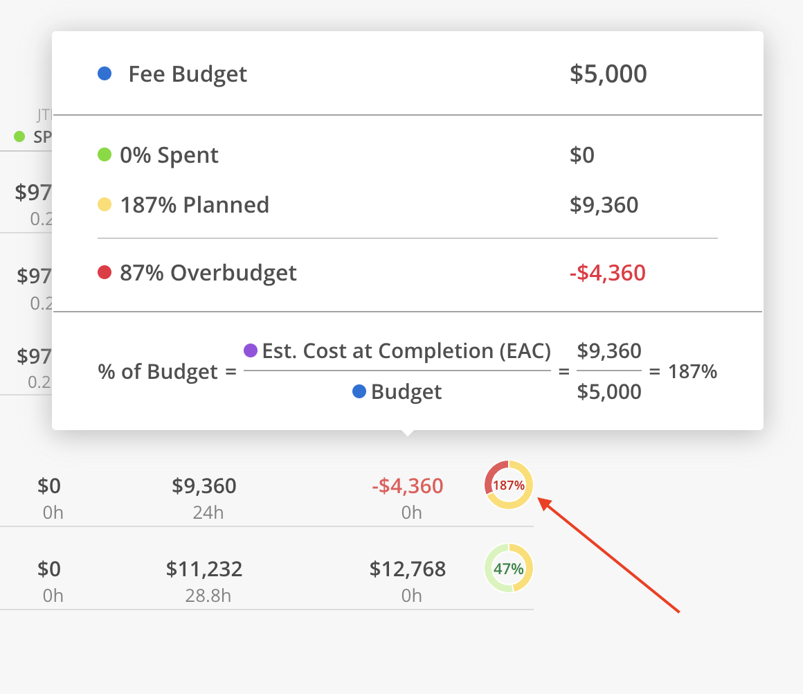 Budget: Shows the total allocated budget for the phase or work category. If the fee is different from the budget, it would be displayed separately on the top of the blue text.