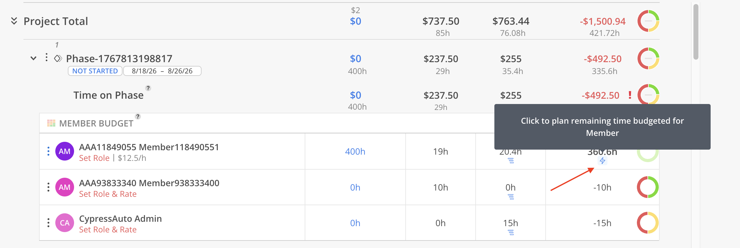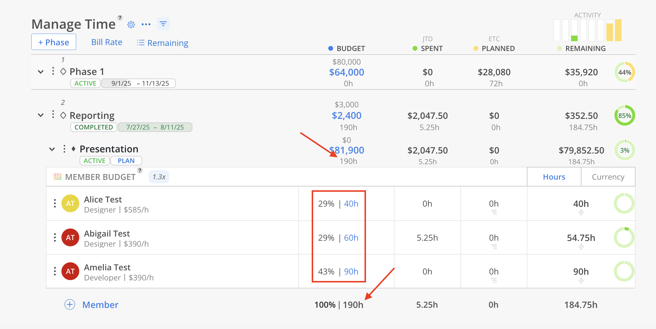 Under the Budget amount, aggregated estimated and remaining hours of members will be displayed in grey text.