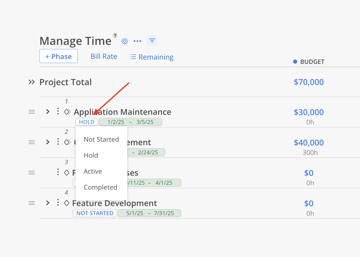 Click on the status button next to the dates on the Phase or Work Category to change the status.