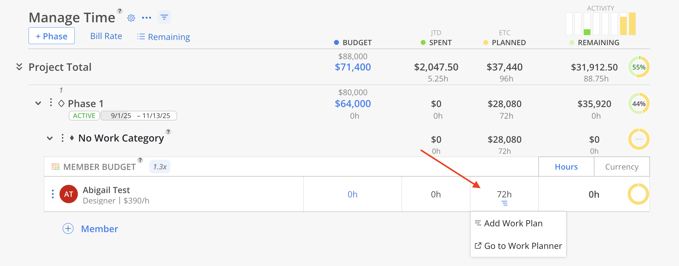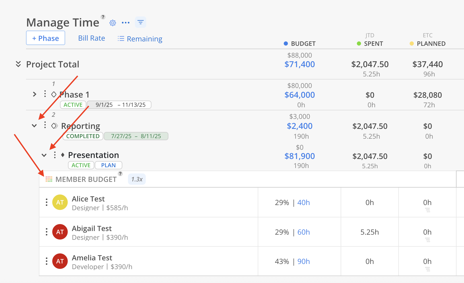 Alternatively, click the icon on the Member Budget table under each Phase or Work Category (if any) to access this view.