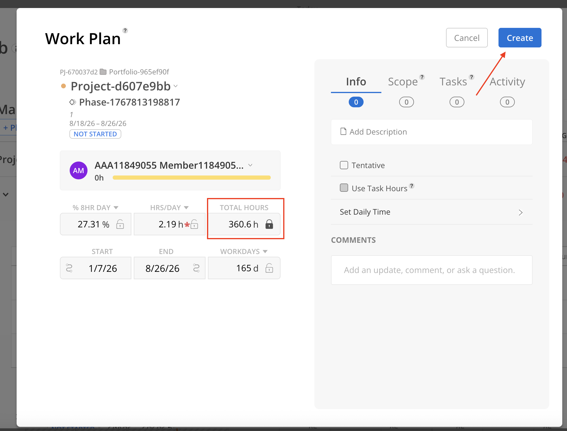 In this modal, the Total Hours field is locked and automatically populated to match the remaining hours. Other Work Plan details can be adjusted as needed. Once all necessary information is updated, select Create to finalize the Work Plan.