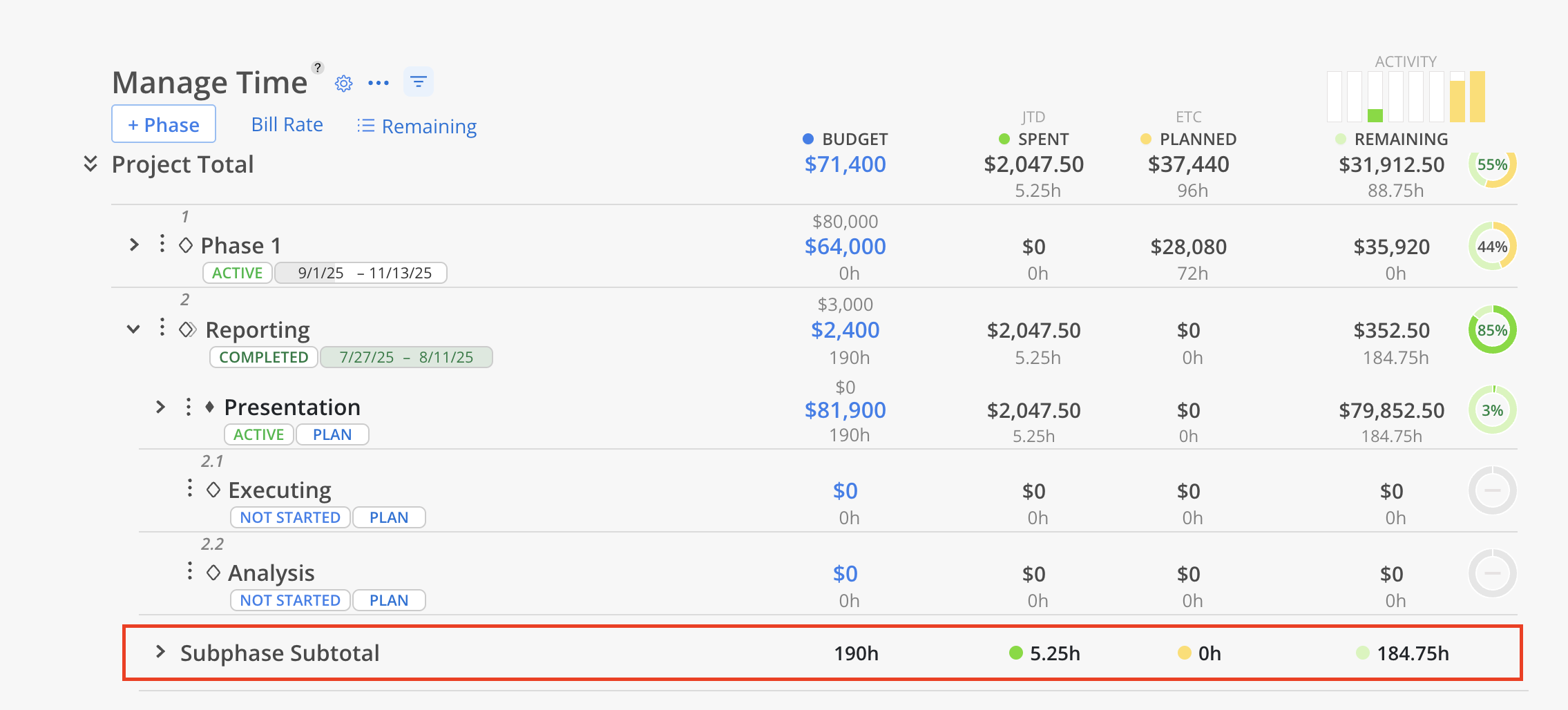 Expand the Subphase Subtotal row to view the aggregated totals for Budgeted Hours, JTD (Job-to-Date) Spent, ETC (Estimate to Complete), and Remaining time across all related Subphases.