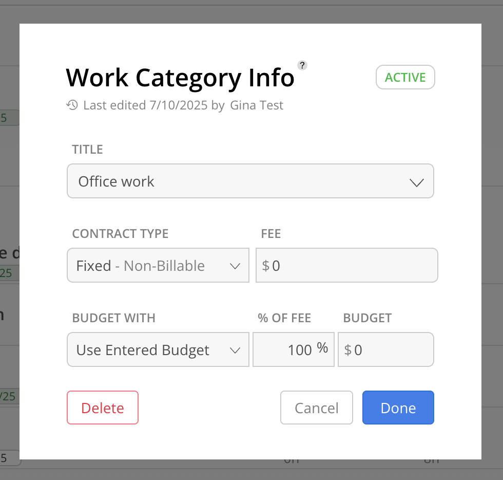Similar to the phase info modal, you will be able to set the Work Category to contract type, edit the name of the custom Work Category, budget and fee amount and budget with option.