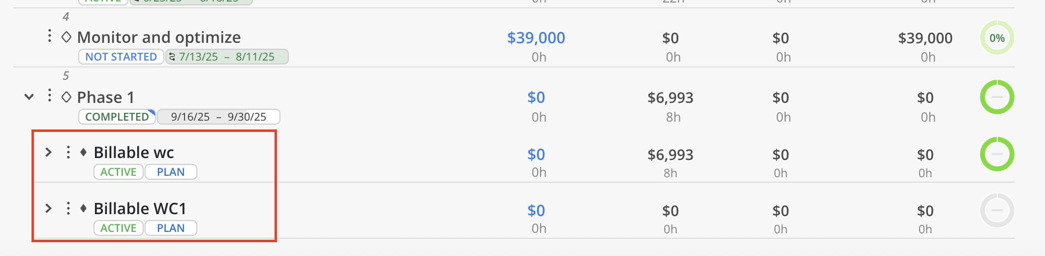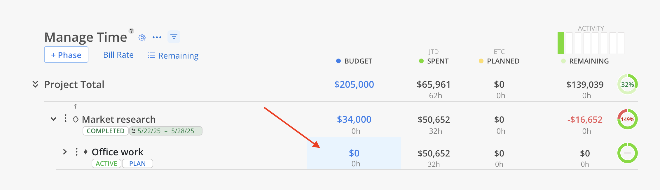 Click the budget amount on a phase. You can set the Phase/Subphase budget information on the Phase Info Modal. The budget and fee on each Phase/Subphase needs to be set separately.