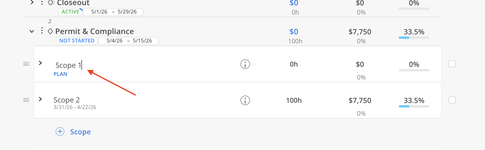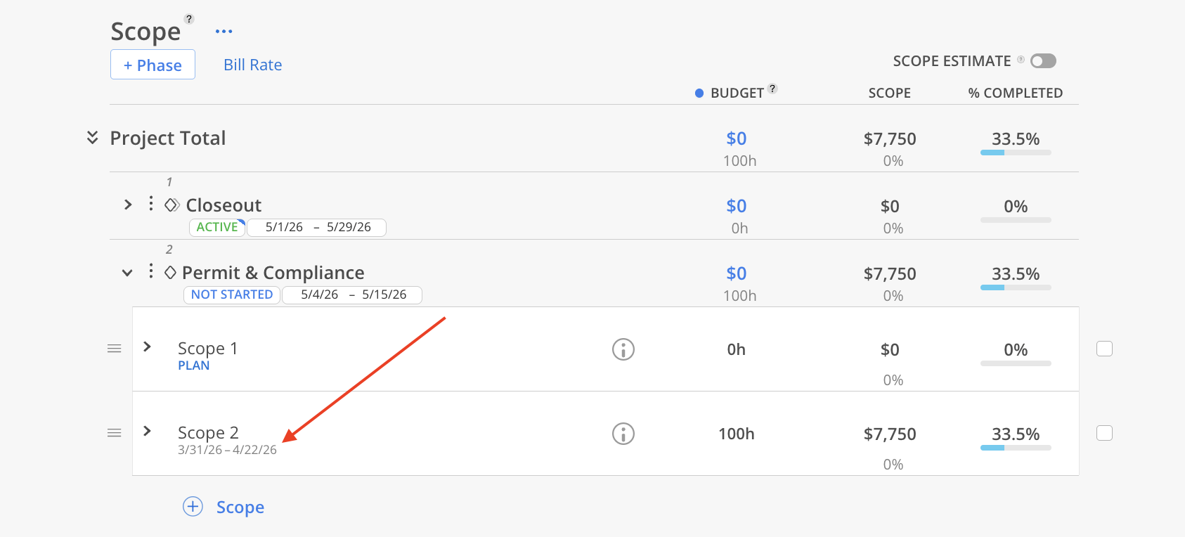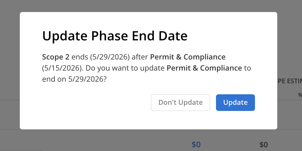 If the end date you set for the new scope falls after the end date of its parent phase or work category, a confirmation dialog will appear before saving. You'll be asked whether you'd like to extend the parent's end date to match the scope. Click Update to extend it automatically, or dismiss the dialog to save the scope without modifying the parent by clicking Don’t Update.