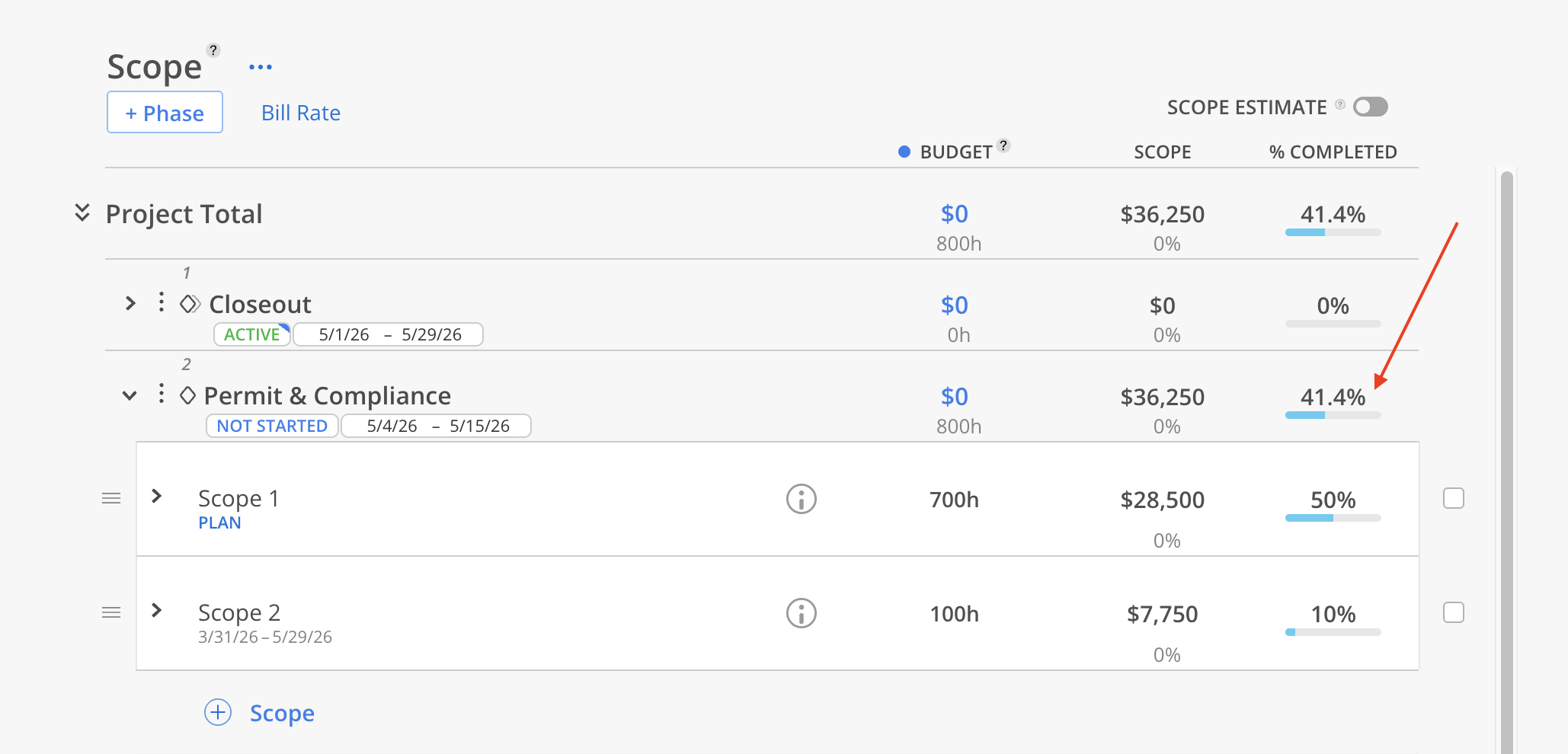 If a Phase or Work Category contains multiple Scopes, the total Budget will reflect the combined values of all associated Scopes.