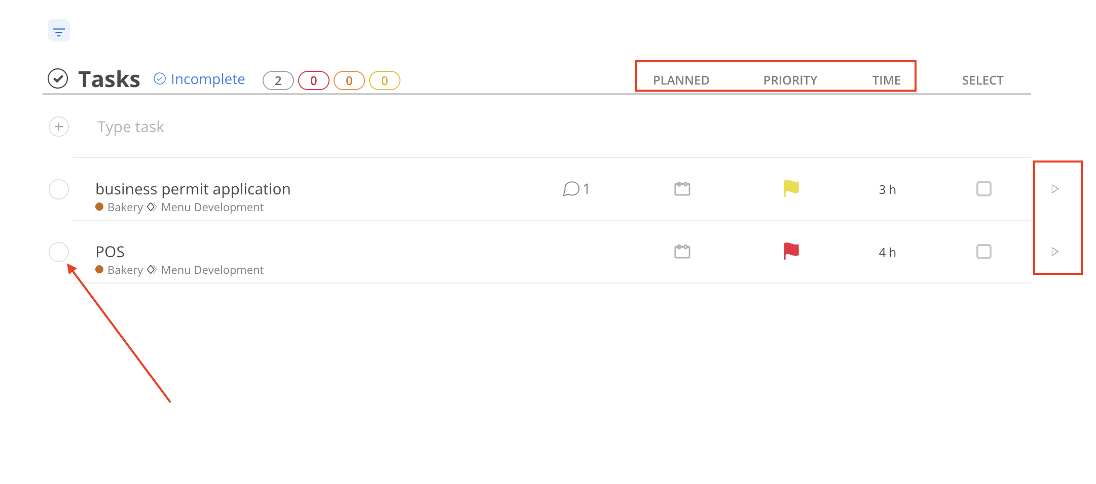 Tasks can be marked as Complete by clicking the circle on the left of each task. Plan Date, Priority and Time Estimate for tasks is possible as well. To start a timer on a task, simply click the play button on the right side of the task.
