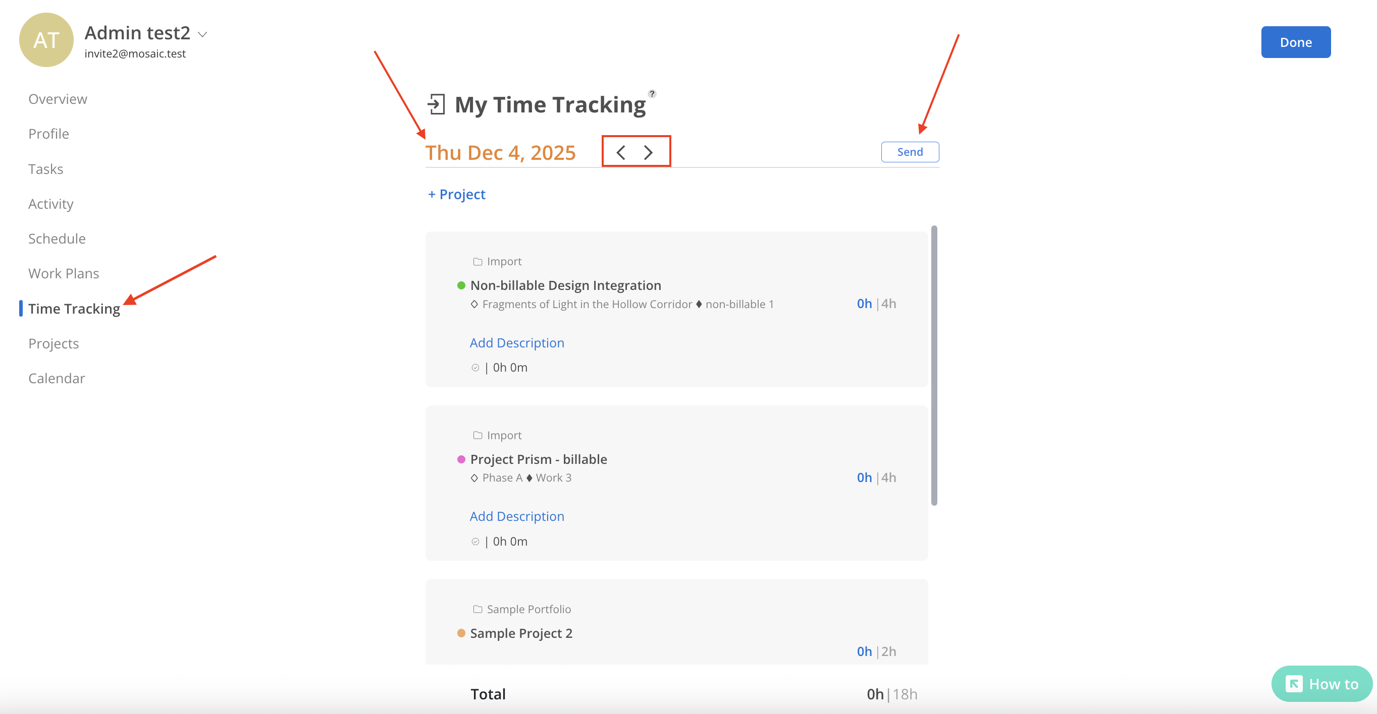 The Time Tracking tab provides an overview of member Time Trackings by day. It displays the number of hours the member is scheduled for each project, phase, and work category today, along with the total hours.