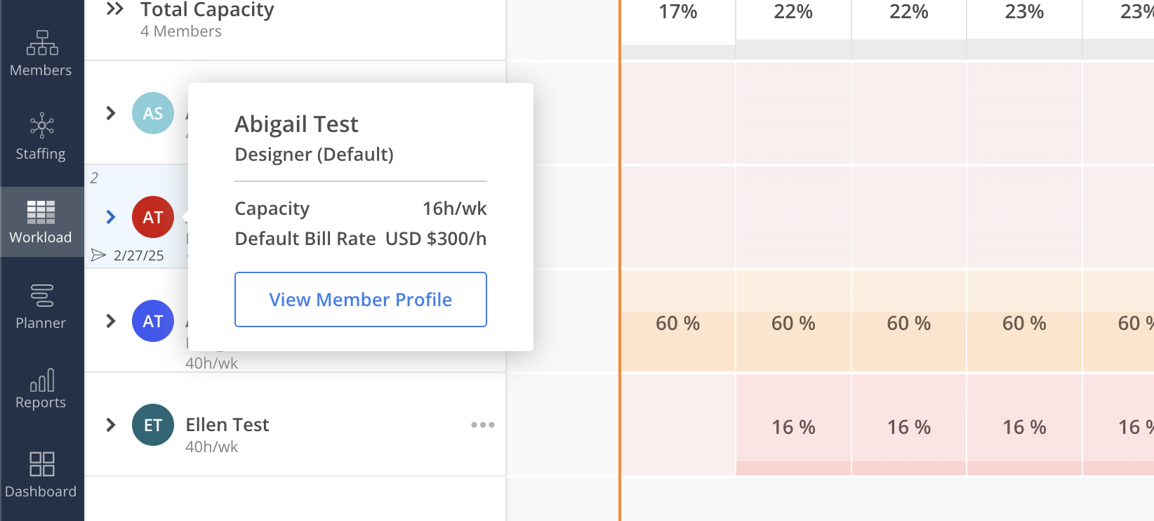 The overcapacity Member count will show on the summary row and the tooltip. In Day View, a Member is considered overcapacity if the daily hours exceed their Daily Capacity. In Quarter View, a Member is considered overcapacity only when the total weekly hours exceed their Weekly Capacity.