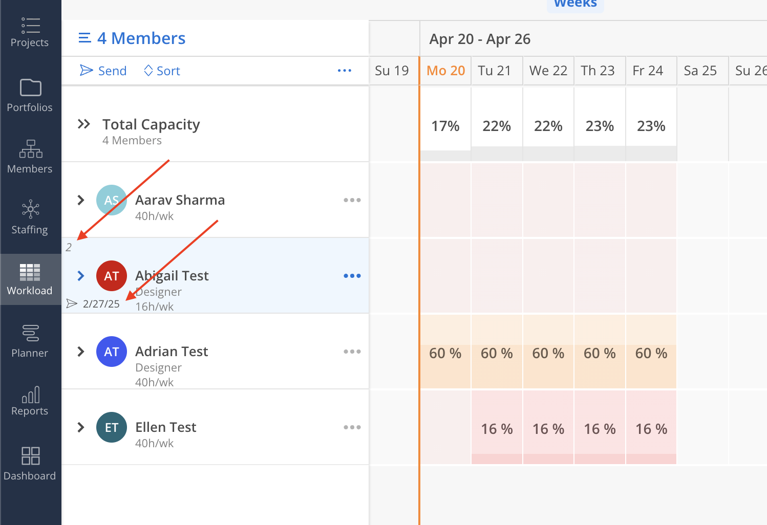 Hover over the Member row to see the row number and last time you shared work plan with this Member