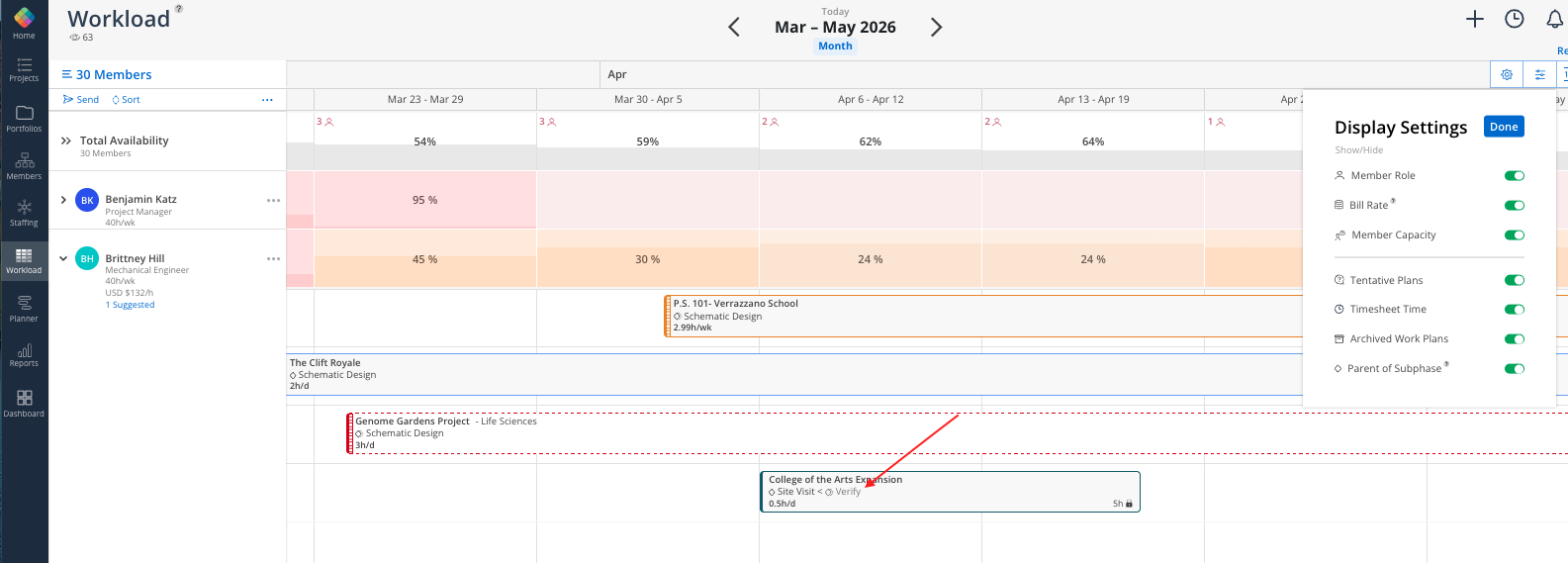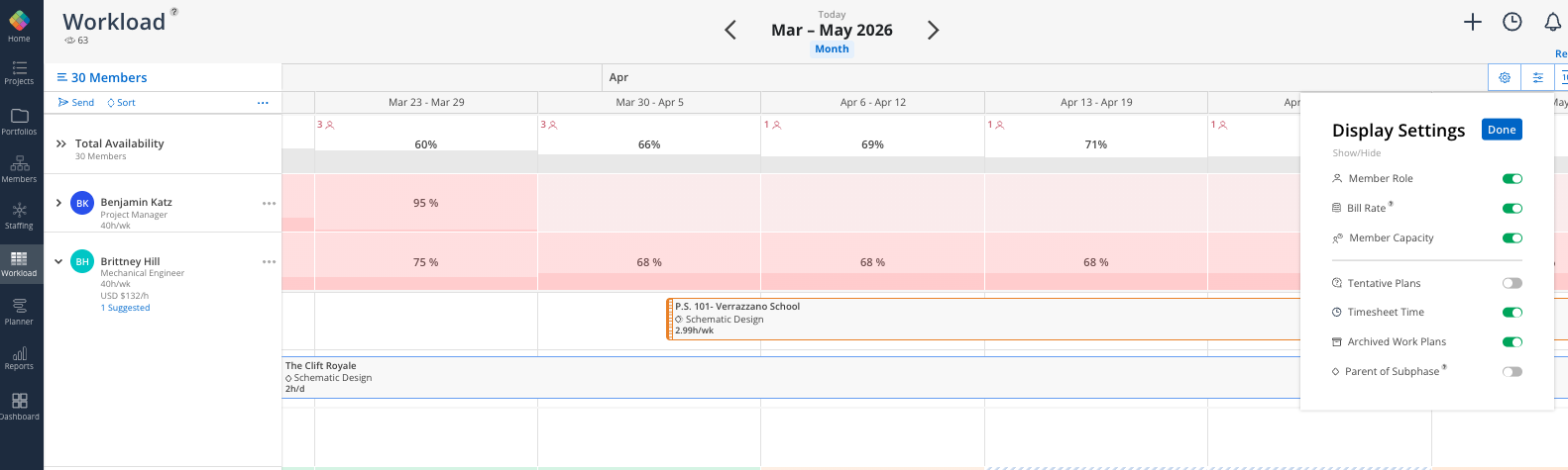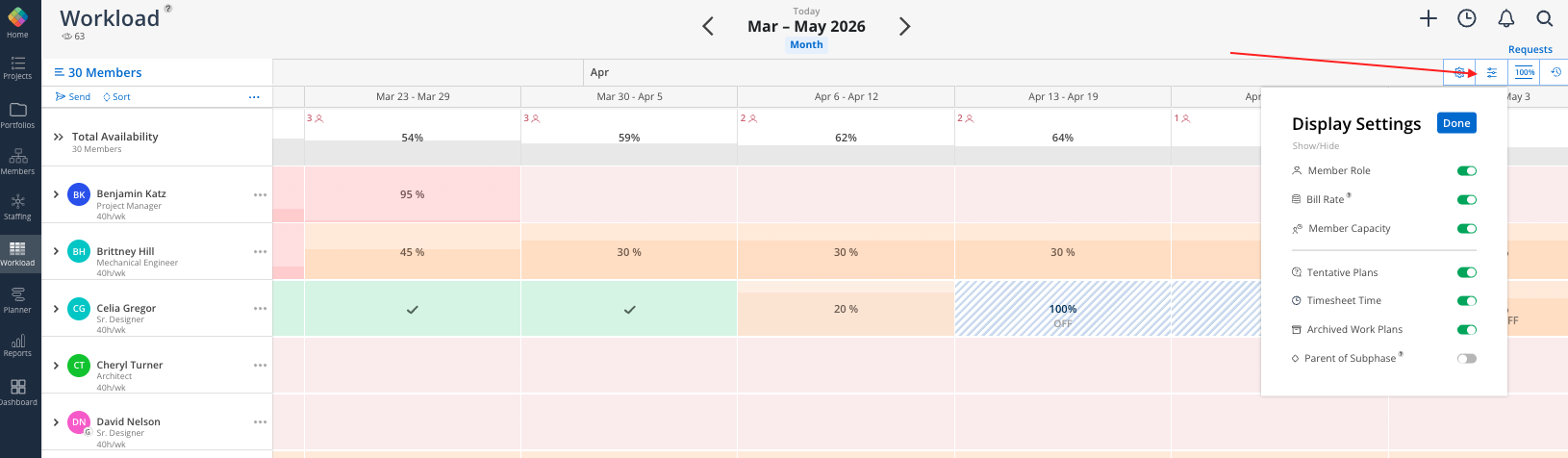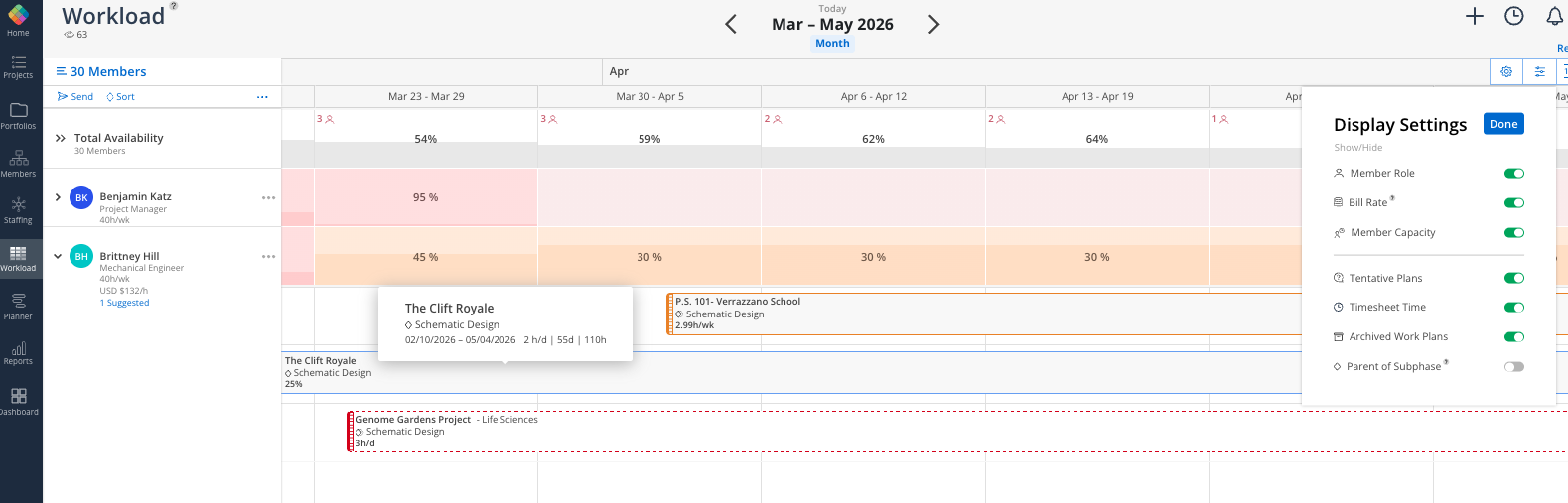 Timesheet Time: Show or hide hours from past time entries in the top left corner of a member's overall capacity and the heatmap tooltip.
