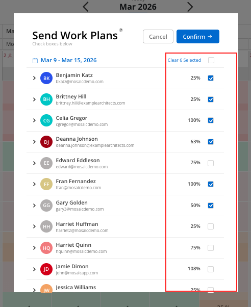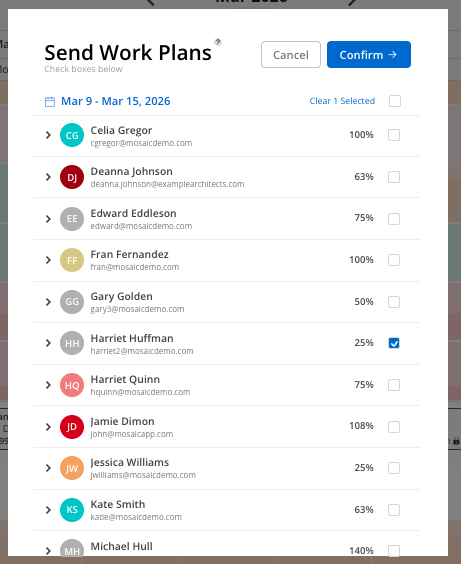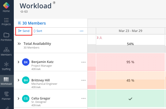All the members you currently have selected in the Workload Space will be displayed as an option to send work plans to. You will also see the percentage of capacity utilized for that member in the selected time period.