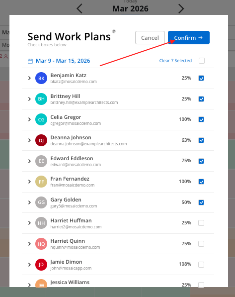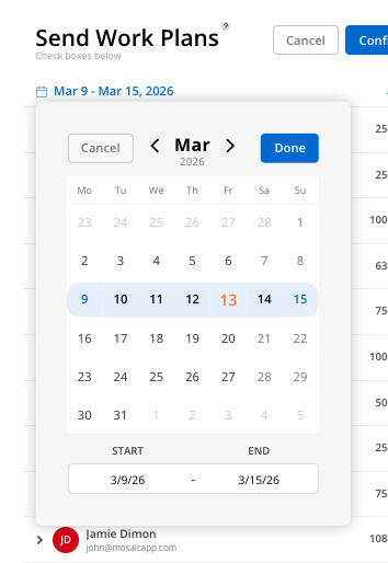 Select the week to send by clicking the date on the top. A calendar modal will appear. Please note, work plans can only be sent for 1 week at a time.