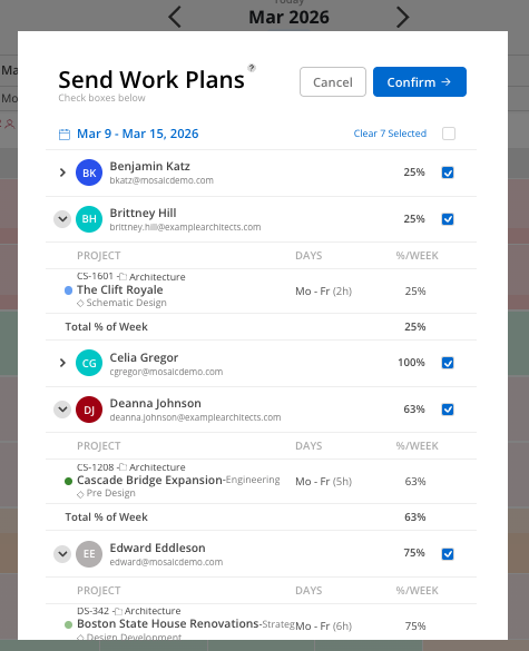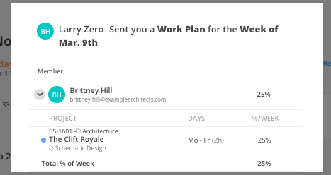 The Member selected will receive a Mosaic notification and an email. Within the Mosaic notification, they can see a full breakdown of the work plans scheduled for them - as well as what percentage of their week that work will utilize.