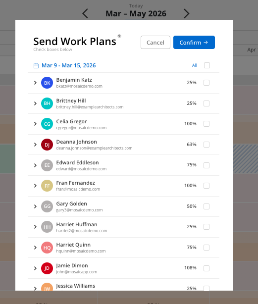 With a few simple clicks, you can now swiftly dispatch comprehensive work plans to your team member’s. This tool not only enhances transparency, but also ensures that everyone is aligned with their responsibilities. The member will receive both an email and a notification in the Mosaic Application.