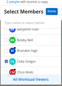 You are also able to select members who will receive a copy of the Work Plans to their email. Select the X Person text and a drop-down list of members will appear. Once the applicable copy members have been selected, click Done. Click Send once you are ready to send.