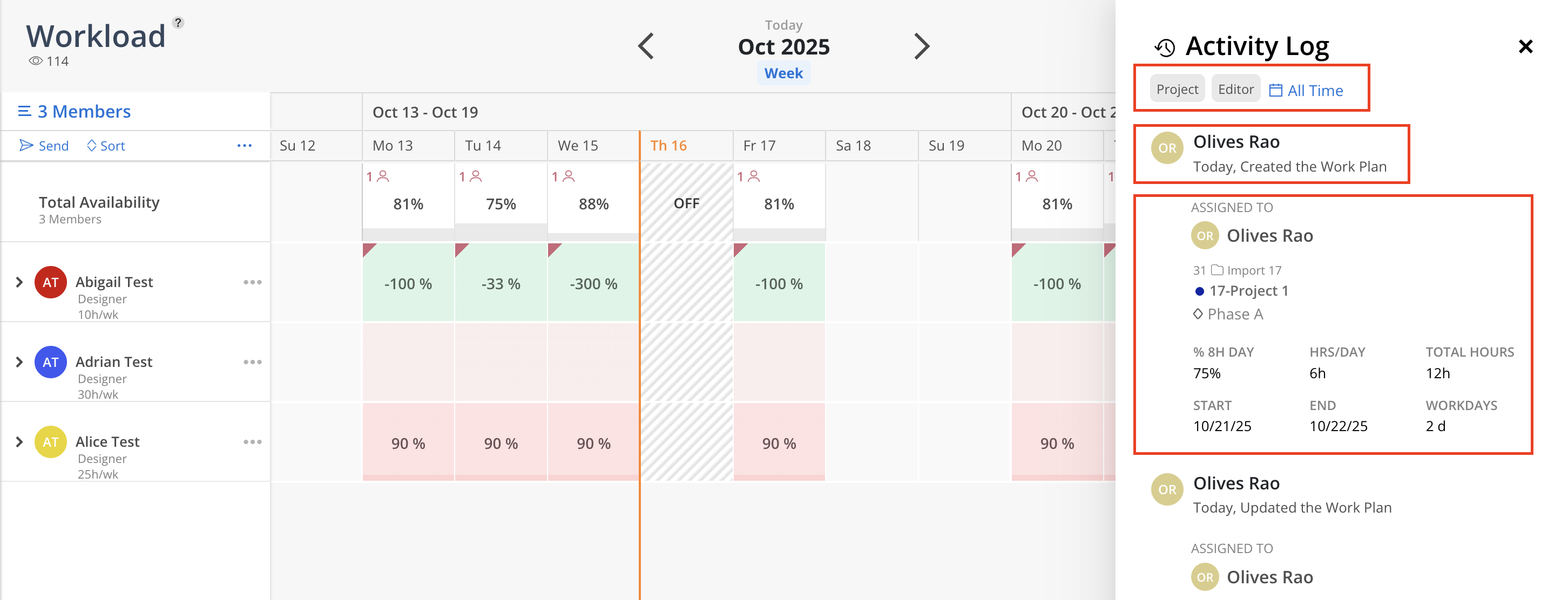 The Activity Log can be accessed in the upper-right corner of the Planner and Workload Space, represented by a clock icon. Clicking it opens a side panel that displays logged actions relevant to the current Project context.