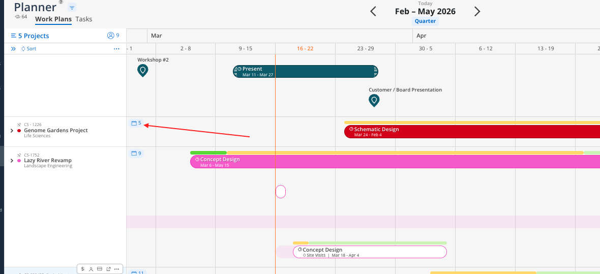 You will also notice bars and icons appearing within each Projects Row. These long bars represent Project Phases and Sub-Phases. A Milestone is designated by a smaller-icon - similar to one you’d see on a map, see below example: