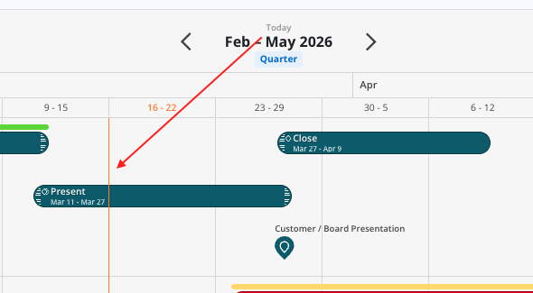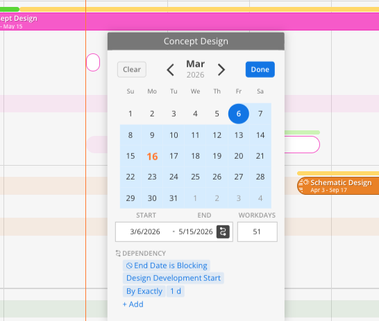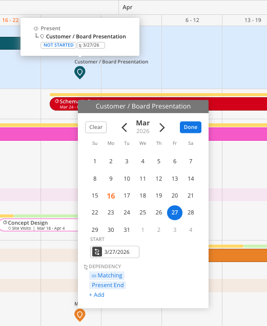 Left-clicking or right-clicking on any Phase or Sub-Phase bars - or Milestone Icons - will open a calendar, allowing for quick adjustments to dates.