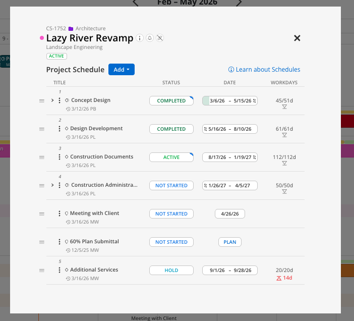 This will open up the Project Schedule Modal, for easy editting and additions: