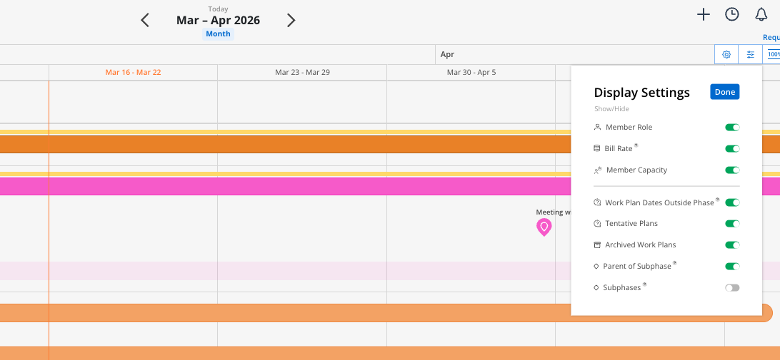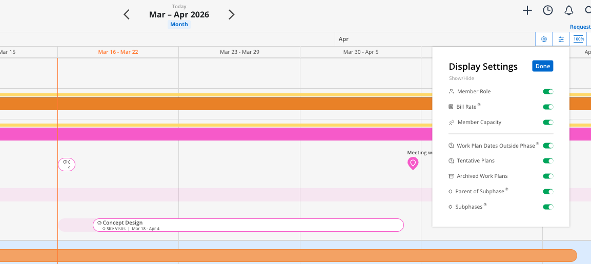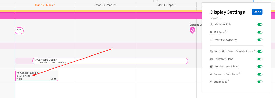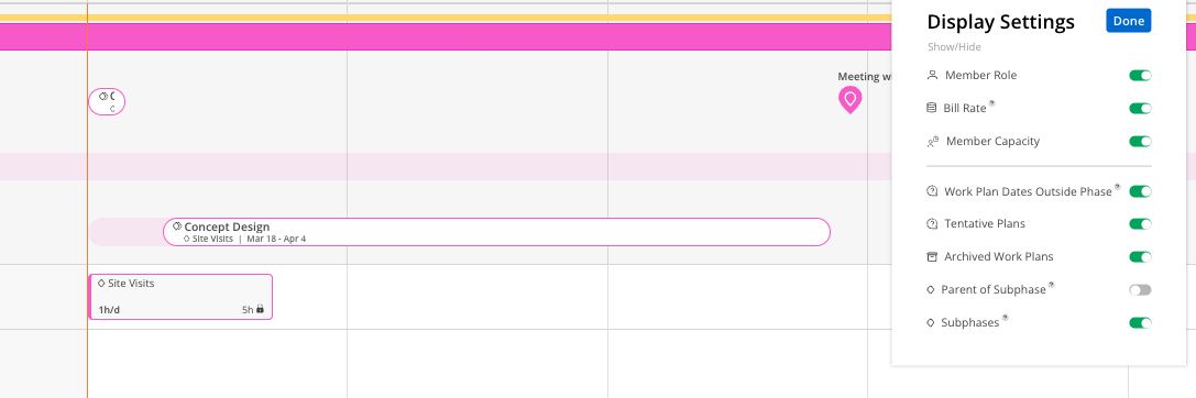 Subphases: Show or hide scheduled Subphases and Work Categories bars.