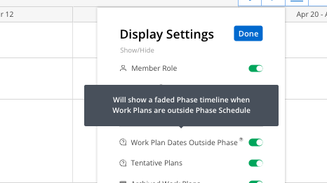 Work Plan Outside Phase Schedule: Show or hide a faded Phase/Subphase bars and Work Plans that are outside of the Phase Schedules