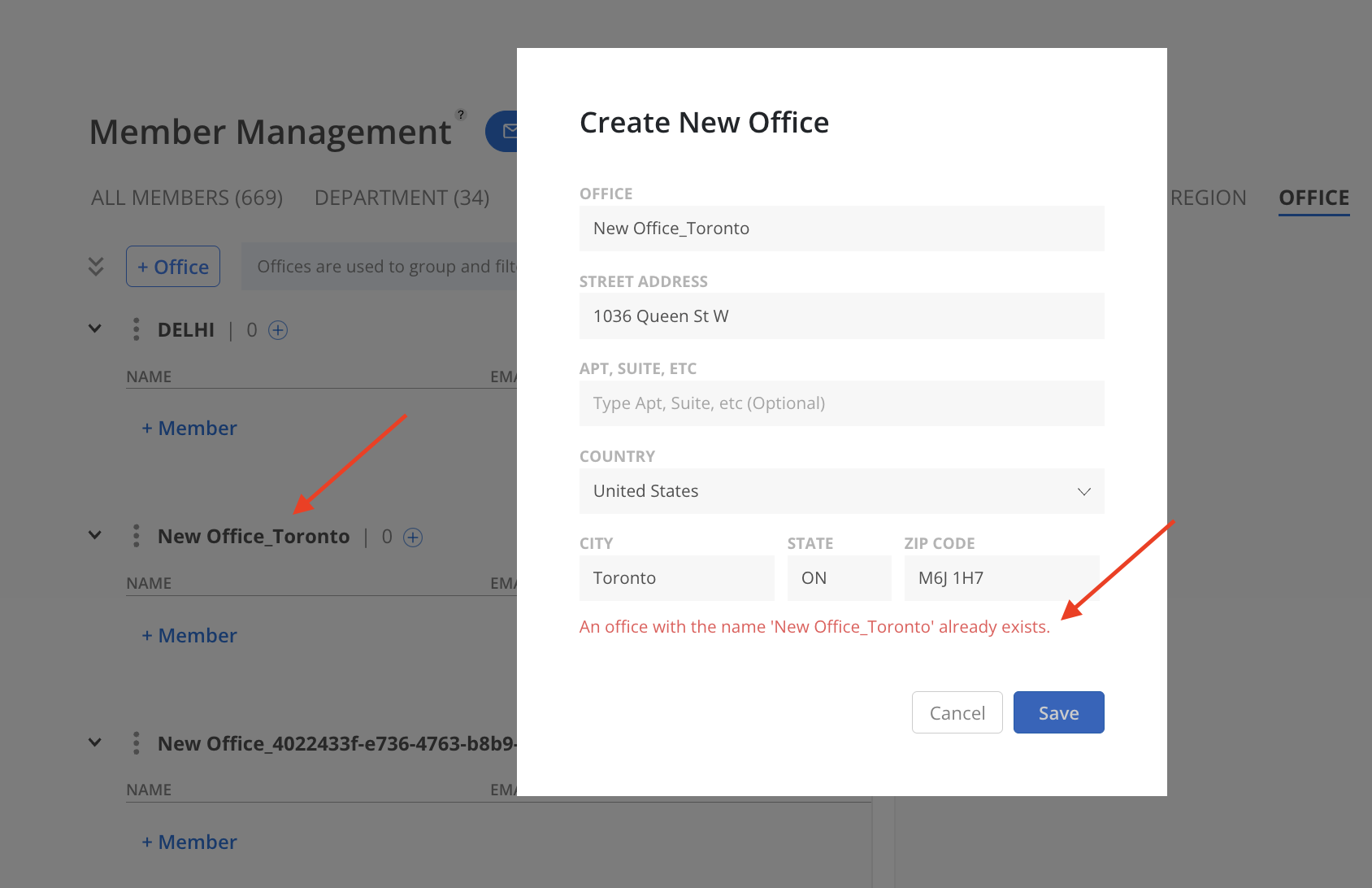 Duplicate office names are not allowed. When attempting to create an office with a duplicate name, the system displays the following error message.